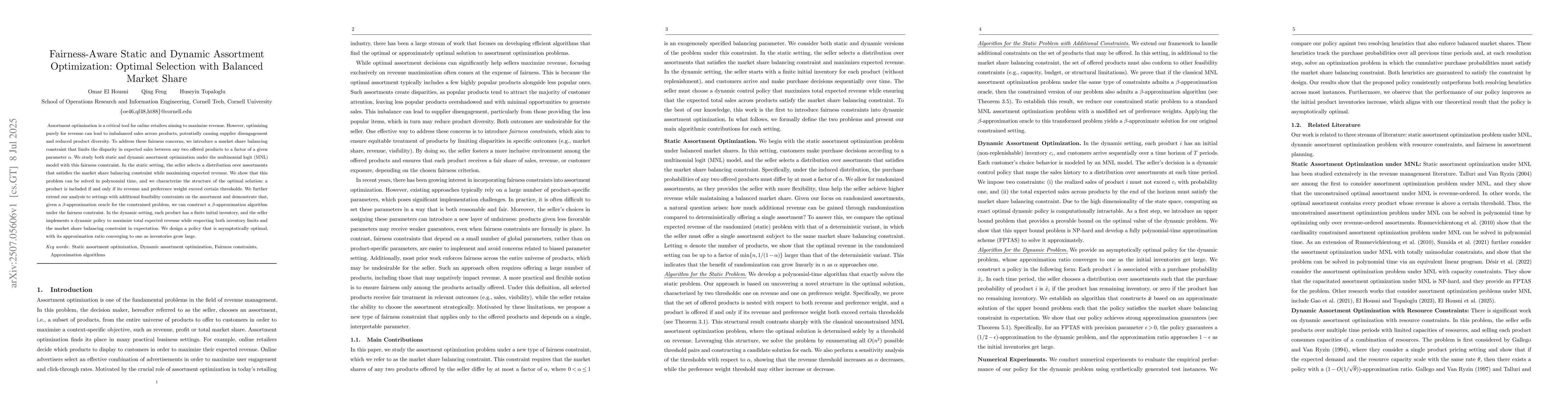This research introduces a fairness-aware approach to assortment optimization, balancing market share while maximizing revenue. It presents polynomial-time solutions for static settings with MNL model, and asymptotically optimal policies for dynamic settings with inventory constraints.