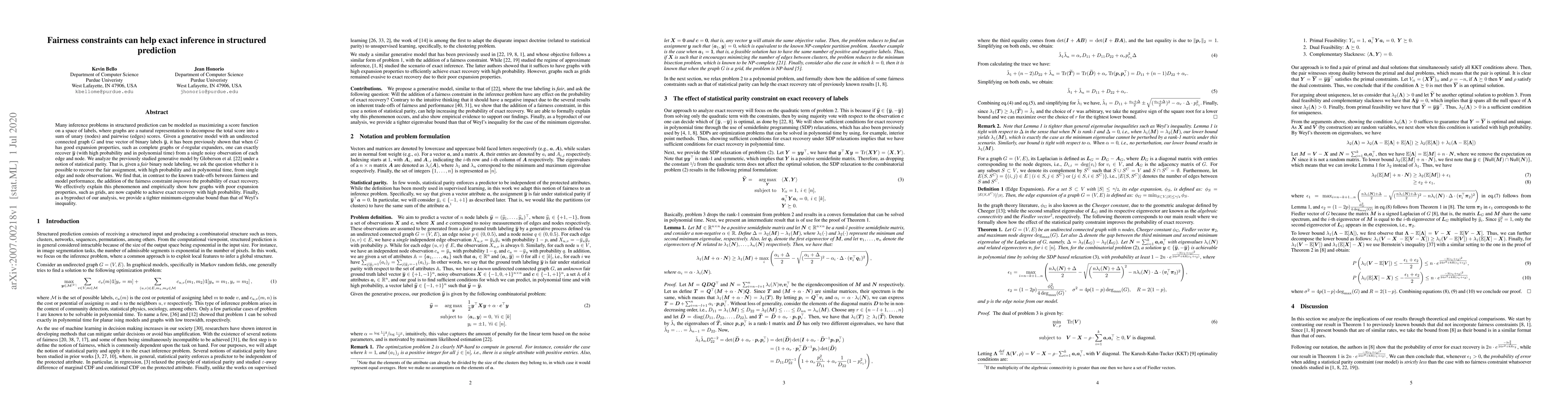 This research shows that incorporating fairness constraints can enhance exact inference in structured prediction problems. Contrary to expectations, fairness constraints improve the likelihood of accurate recovery in polynomial time, even for graphs with poor expansion properties. The study also offers a tighter minimum-eigenvalue bound than Weyl's inequality.