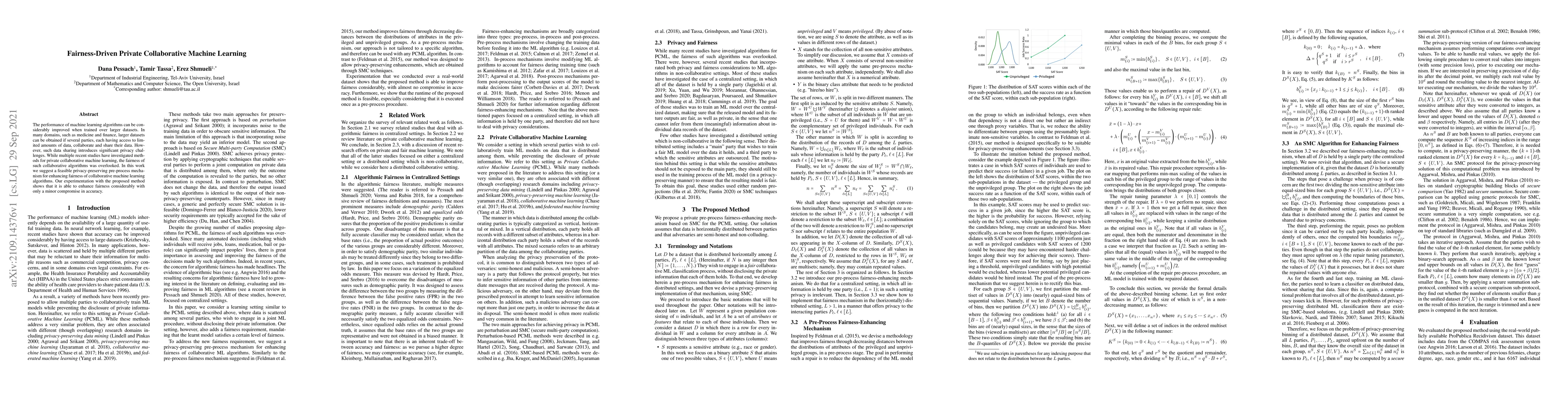 This paper proposes a privacy-preserving mechanism to enhance fairness in collaborative machine learning, addressing the overlooked issue of fairness in existing private data sharing methods. The method achieves significant fairness improvements with minimal reduction in accuracy.