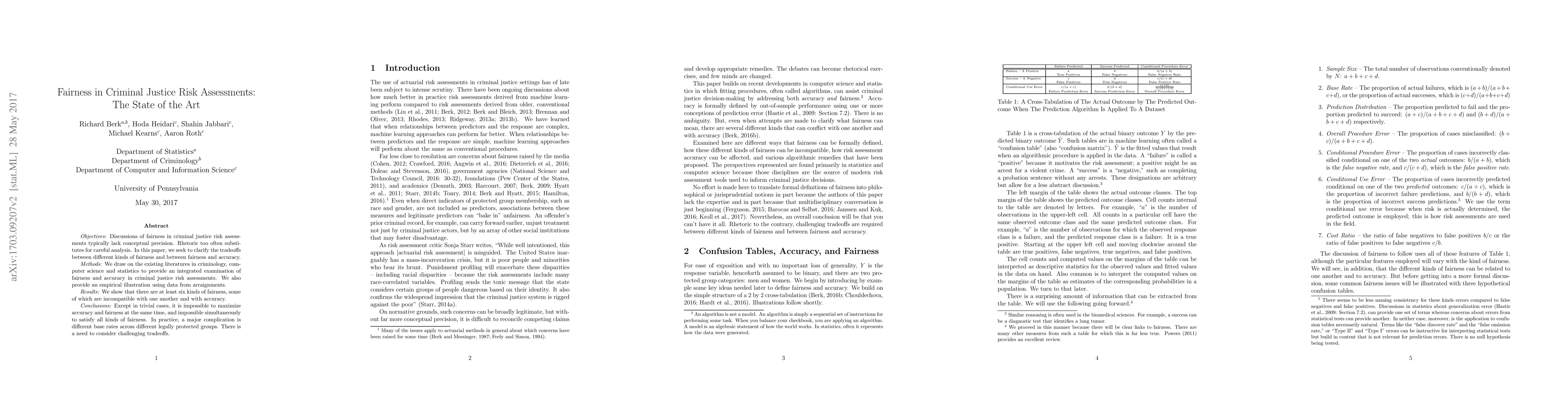 Objectives: Discussions of fairness in criminal justice risk assessments typically lack conceptual precision. Rhetoric too often substitutes for careful analysis. In this paper, we seek to clarify the tradeoffs between different kinds of fairness and between fairness and accuracy. Methods: We draw on the existing literatures in criminology, computer science and statistics to provide an integrated examination of fairness and accuracy in criminal justice risk assessments. We also provide an empirical illustration using data from arraignments. Results: We show that there are at least six kinds of fairness, some of which are incompatible with one another and with accuracy. Conclusions: Except in trivial cases, it is impossible to maximize accuracy and fairness at the same time, and impossible simultaneously to satisfy all kinds of fairness. In practice, a major complication is different base rates across different legally protected groups. There is a need to consider challenging tradeoffs.