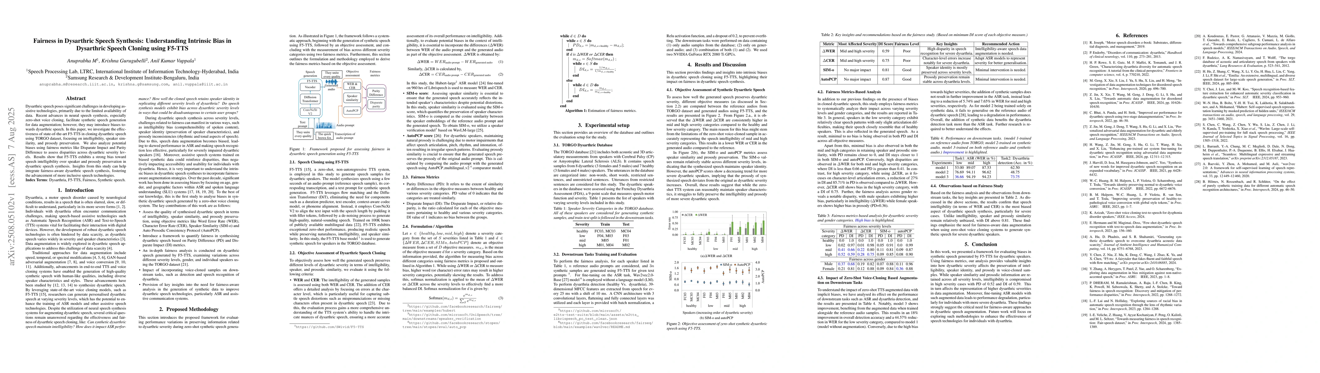 Dysarthric speech poses significant challenges in developing assistive technologies, primarily due to the limited availability of data. Recent advances in neural speech synthesis, especially zero-shot voice cloning, facilitate synthetic speech generation for data augmentation; however, they may introduce biases towards dysarthric speech. In this paper, we investigate the effectiveness of state-of-the-art F5-TTS in cloning dysarthric speech using TORGO dataset, focusing on intelligibility, speaker similarity, and prosody preservation. We also analyze potential biases using fairness metrics like Disparate Impact and Parity Difference to assess disparities across dysarthric severity levels. Results show that F5-TTS exhibits a strong bias toward speech intelligibility over speaker and prosody preservation in dysarthric speech synthesis. Insights from this study can help integrate fairness-aware dysarthric speech synthesis, fostering the advancement of more inclusive speech technologies.