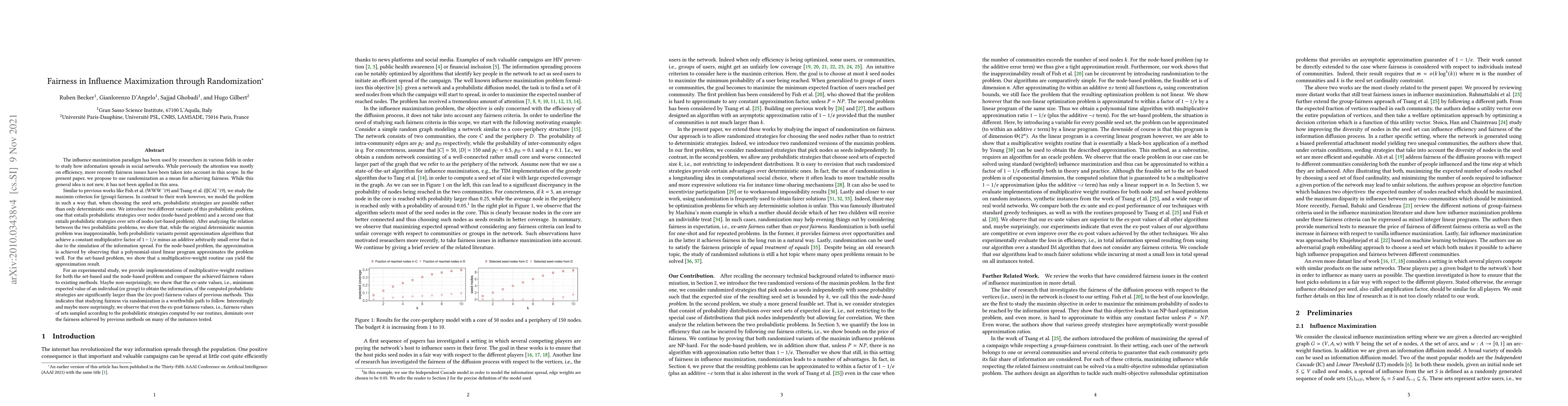 This paper proposes using randomization to achieve fairness in influence maximization, introducing probabilistic strategies over nodes and sets. Unlike deterministic approaches, the probabilistic variants allow for approximation algorithms that outperform previous deterministic methods in terms of both ex-ante and ex-post fairness values.