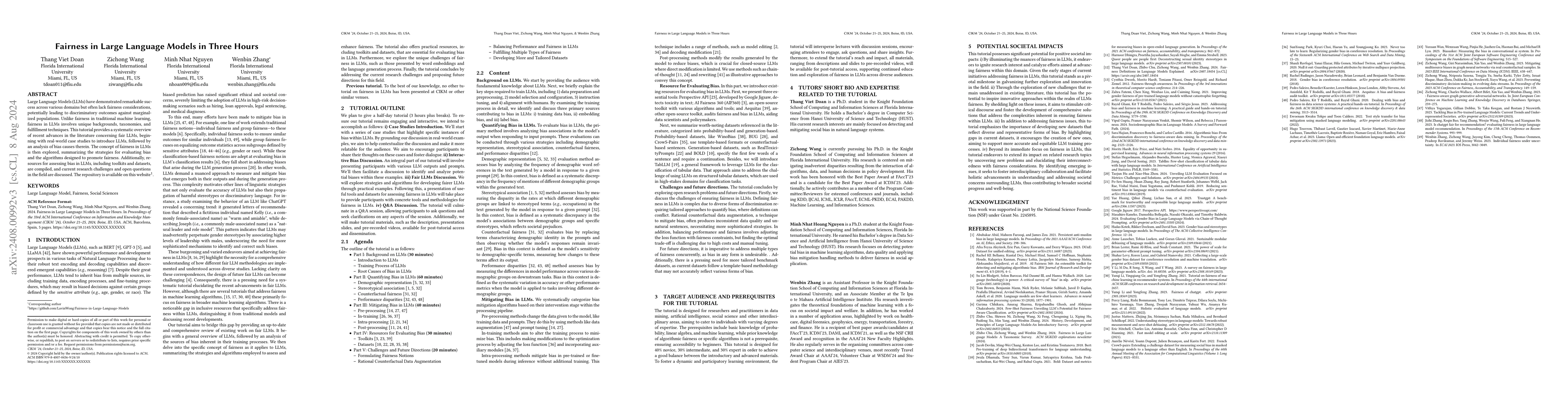Large Language Models (LLMs) have demonstrated remarkable success across various domains but often lack fairness considerations, potentially leading to discriminatory outcomes against marginalized populations. Unlike fairness in traditional machine learning, fairness in LLMs involves unique backgrounds, taxonomies, and fulfillment techniques. This tutorial provides a systematic overview of recent advances in the literature concerning fair LLMs, beginning with real-world case studies to introduce LLMs, followed by an analysis of bias causes therein. The concept of fairness in LLMs is then explored, summarizing the strategies for evaluating bias and the algorithms designed to promote fairness. Additionally, resources for assessing bias in LLMs, including toolkits and datasets, are compiled, and current research challenges and open questions in the field are discussed. The repository is available at \url{https://github.com/LavinWong/Fairness-in-Large-Language-Models}.