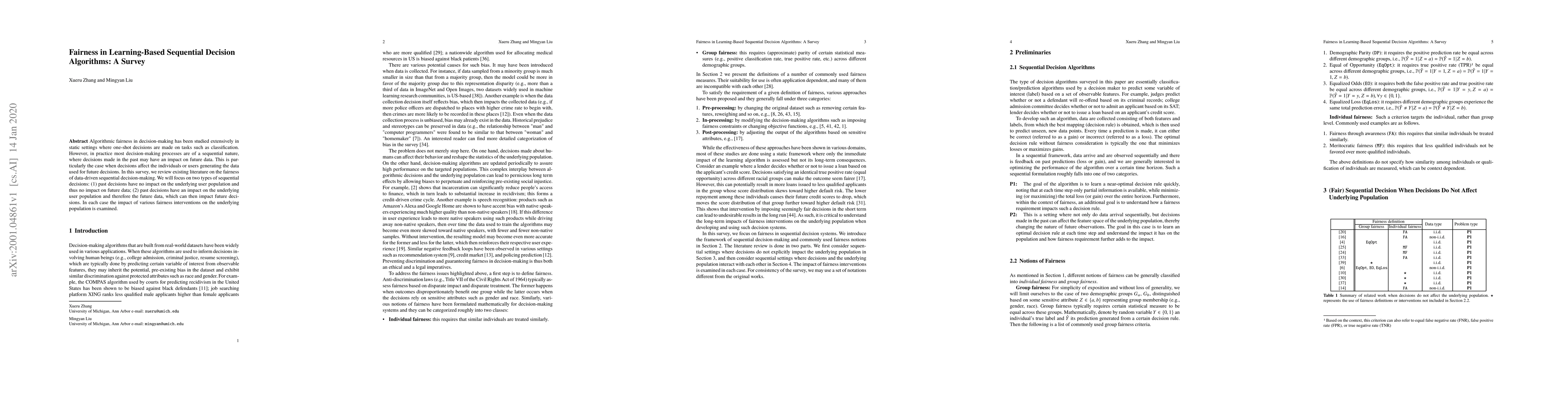 The paper provides a survey of existing literature on fairness in learning-based sequential decision algorithms, focusing on two classes of sequential decisions: (1) where past decisions have no impact on future data, and (2) where past decisions impact both the user population and future data.