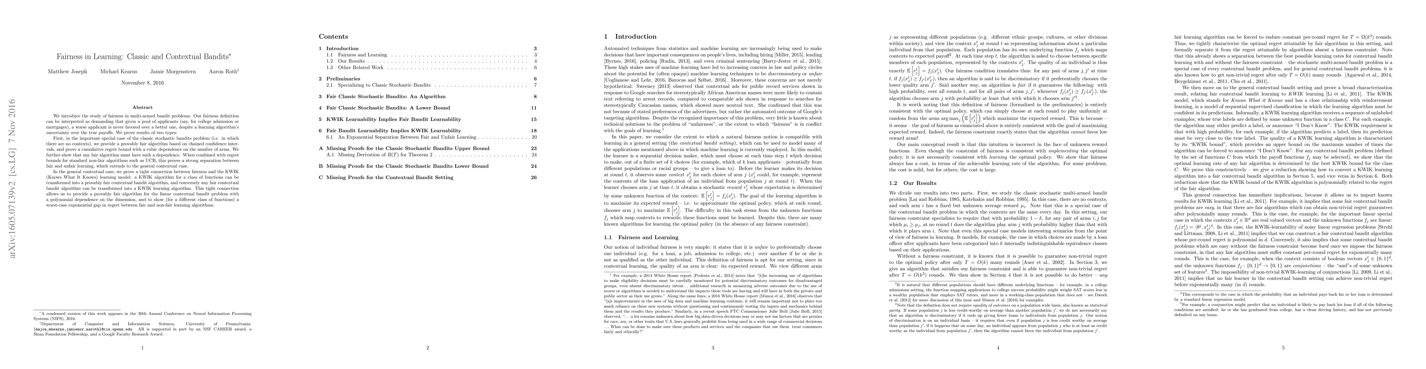 We introduce the study of fairness in multi-armed bandit problems. Our fairness definition can be interpreted as demanding that given a pool of applicants (say, for college admission or mortgages), a worse applicant is never favored over a better one, despite a learning algorithm's uncertainty over the true payoffs. We prove results of two types. First, in the important special case of the classic stochastic bandits problem (i.e., in which there are no contexts), we provide a provably fair algorithm based on "chained" confidence intervals, and provide a cumulative regret bound with a cubic dependence on the number of arms. We further show that any fair algorithm must have such a dependence. When combined with regret bounds for standard non-fair algorithms such as UCB, this proves a strong separation between fair and unfair learning, which extends to the general contextual case. In the general contextual case, we prove a tight connection between fairness and the KWIK (Knows What It Knows) learning model: a KWIK algorithm for a class of functions can be transformed into a provably fair contextual bandit algorithm, and conversely any fair contextual bandit algorithm can be transformed into a KWIK learning algorithm. This tight connection allows us to provide a provably fair algorithm for the linear contextual bandit problem with a polynomial dependence on the dimension, and to show (for a different class of functions) a worst-case exponential gap in regret between fair and non-fair learning algorithms