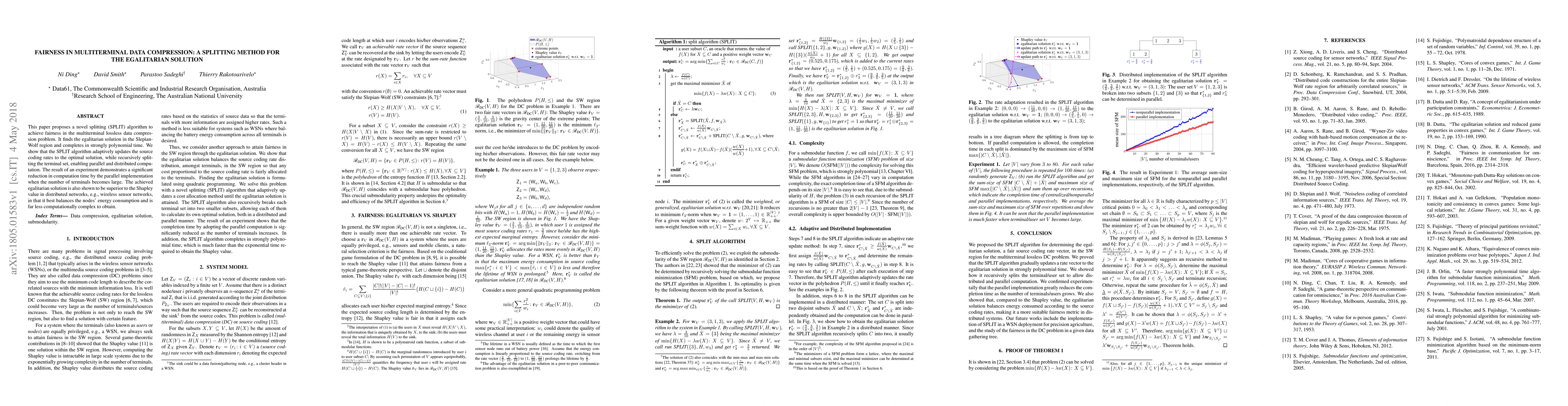 This paper proposes a novel splitting (SPLIT) algorithm to achieve fairness in the multiterminal lossless data compression problem. It finds the egalitarian solution in the Slepian-Wolf region and completes in strongly polynomial time. We show that the SPLIT algorithm adaptively updates the source coding rates to the optimal solution, while recursively splitting the terminal set, enabling parallel and distributed computation. The result of an experiment demonstrates a significant reduction in computation time by the parallel implementation when the number of terminals becomes large. The achieved egalitarian solution is also shown to be superior to the Shapley value in distributed networks, e.g., wireless sensor networks, in that it best balances the nodes' energy consumption and is far less computationally complex to obtain.