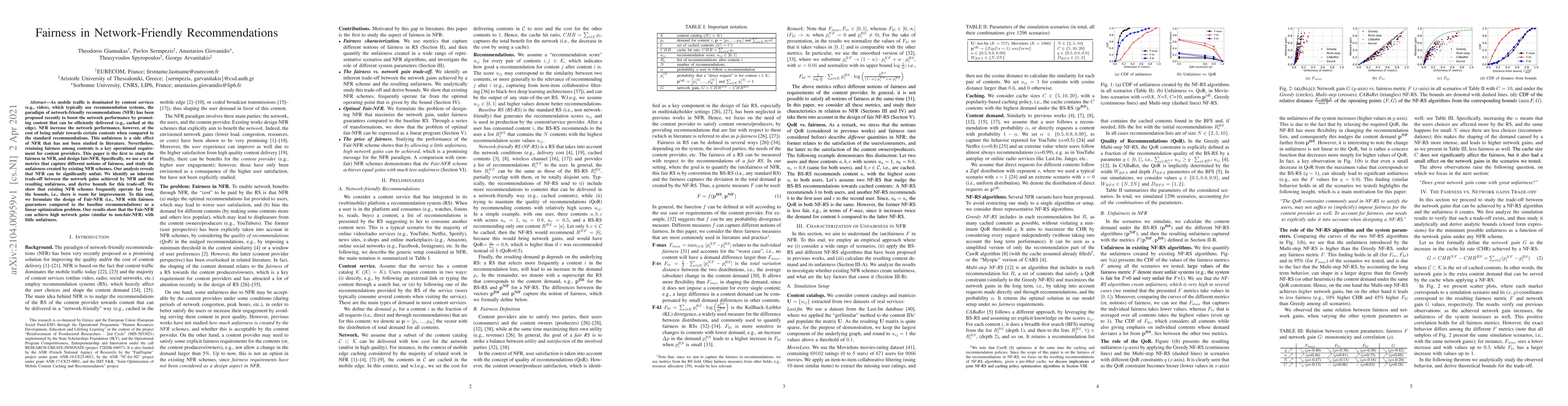 As mobile traffic is dominated by content services (e.g., video), which typically use recommendation systems, the paradigm of network-friendly recommendations (NFR) has been proposed recently to boost the network performance by promoting content that can be efficiently delivered (e.g., cached at the edge). NFR increase the network performance, however, at the cost of being unfair towards certain contents when compared to the standard recommendations. This unfairness is a side effect of NFR that has not been studied in literature. Nevertheless, retaining fairness among contents is a key operational requirement for content providers. This paper is the first to study the fairness in NFR, and design fair-NFR. Specifically, we use a set of metrics that capture different notions of fairness, and study the unfairness created by existing NFR schemes. Our analysis reveals that NFR can be significantly unfair. We identify an inherent trade-off between the network gains achieved by NFR and the resulting unfairness, and derive bounds for this trade-off. We show that existing NFR schemes frequently operate far from the bounds, i.e., there is room for improvement. To this end, we formulate the design of Fair-NFR (i.e., NFR with fairness guarantees compared to the baseline recommendations) as a linear optimization problem. Our results show that the Fair-NFR can achieve high network gains (similar to non-fair-NFR) with little unfairness.