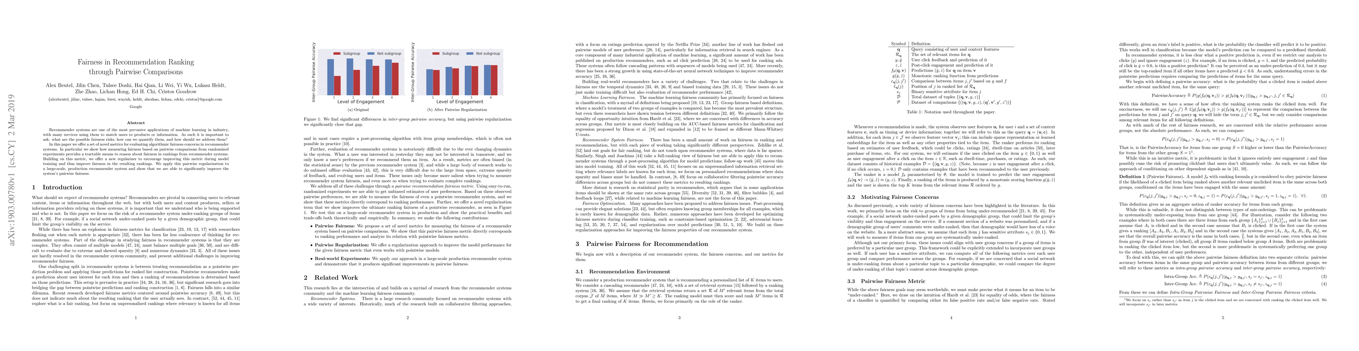 Recommender systems are one of the most pervasive applications of machine learning in industry, with many services using them to match users to products or information. As such it is important to ask: what are the possible fairness risks, how can we quantify them, and how should we address them? In this paper we offer a set of novel metrics for evaluating algorithmic fairness concerns in recommender systems. In particular we show how measuring fairness based on pairwise comparisons from randomized experiments provides a tractable means to reason about fairness in rankings from recommender systems. Building on this metric, we offer a new regularizer to encourage improving this metric during model training and thus improve fairness in the resulting rankings. We apply this pairwise regularization to a large-scale, production recommender system and show that we are able to significantly improve the system's pairwise fairness.
