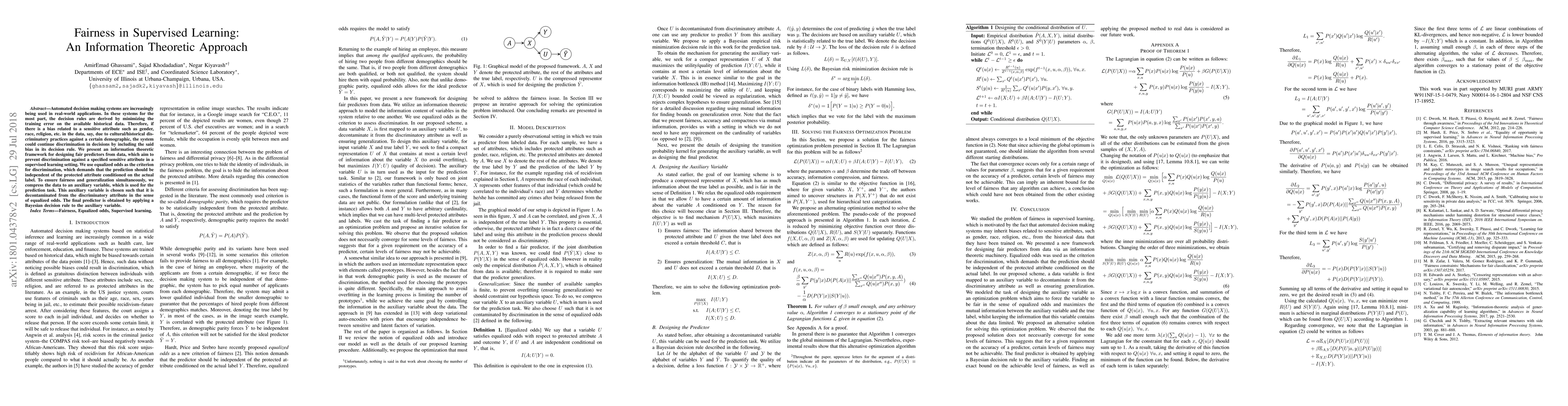 This paper proposes an information theoretic framework to design fair predictors in supervised learning, aiming to prevent discrimination based on sensitive attributes like gender or race. It uses equalized odds as a fairness criterion, compressing data into an auxiliary variable devoid of discriminatory attributes for prediction, ensuring both fairness and generalization.