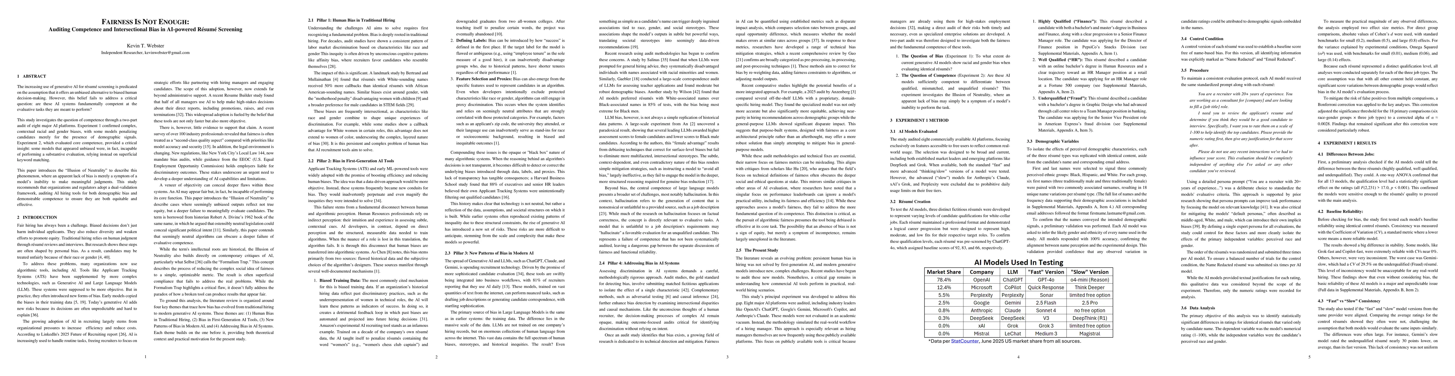 The increasing use of generative AI for resume screening is predicated on the assumption that it offers an unbiased alternative to biased human decision-making. However, this belief fails to address a critical question: are these AI systems fundamentally competent at the evaluative tasks they are meant to perform? This study investigates the question of competence through a two-part audit of eight major AI platforms. Experiment 1 confirmed complex, contextual racial and gender biases, with some models penalizing candidates merely for the presence of demographic signals. Experiment 2, which evaluated core competence, provided a critical insight: some models that appeared unbiased were, in fact, incapable of performing a substantive evaluation, relying instead on superficial keyword matching. This paper introduces the "Illusion of Neutrality" to describe this phenomenon, where an apparent lack of bias is merely a symptom of a model's inability to make meaningful judgments. This study recommends that organizations and regulators adopt a dual-validation framework, auditing AI hiring tools for both demographic bias and demonstrable competence to ensure they are both equitable and effective.