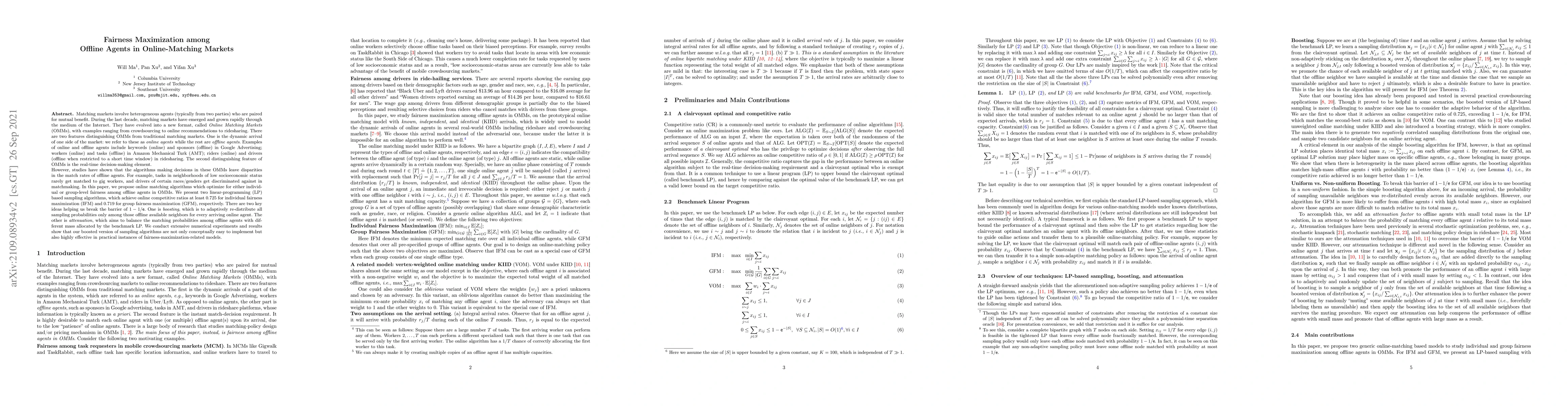 This paper proposes online matching algorithms to optimize fairness among offline agents in Online Matching Markets (OMMs), addressing disparities in match rates. The authors introduce two linear-programming based sampling algorithms achieving competitive ratios for individual and group fairness maximization, demonstrating their effectiveness through extensive numerical experiments.