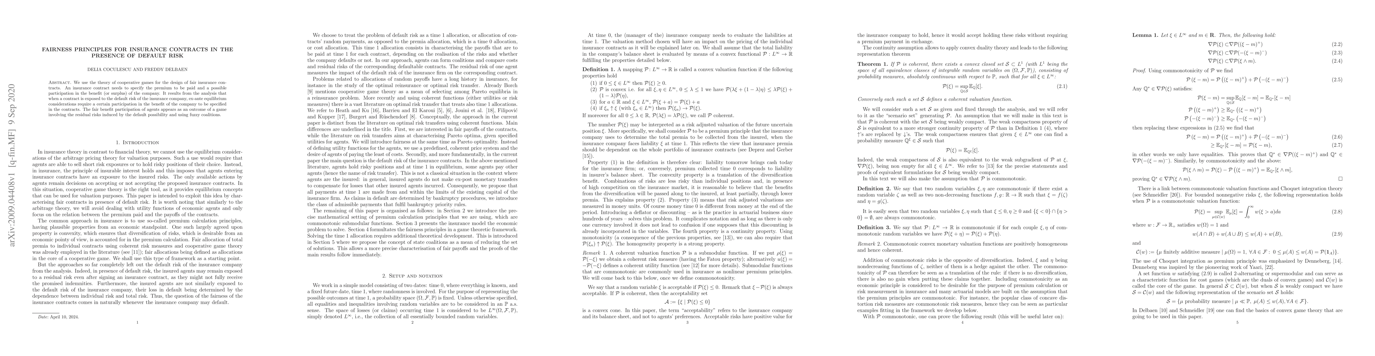 This paper employs cooperative game theory to design fair insurance contracts that account for the default risk of the insurance company. It concludes that to achieve fair outcomes, contracts should specify a certain level of benefit participation for agents, determined through a game involving residual risks and fuzzy coalitions.