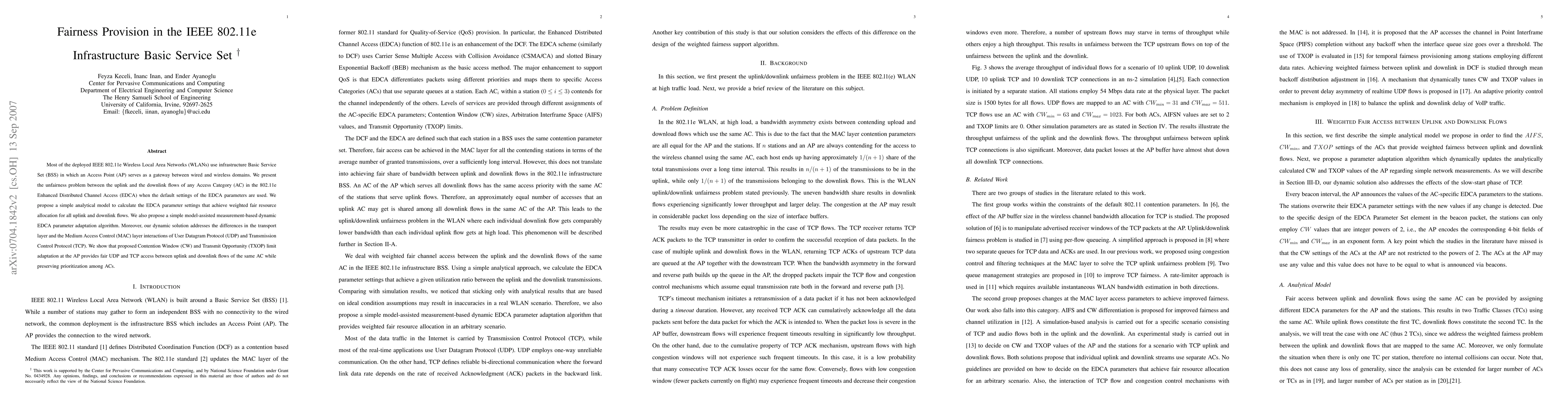 This paper addresses the fairness issue in IEEE 802.11e WLANs, specifically the imbalance between uplink and downlink flows in the Enhanced Distributed Channel Access (EDCA). It proposes an analytical model and a dynamic adaptation algorithm to achieve fair resource allocation, considering both UDP and TCP traffic, while maintaining access category prioritization.