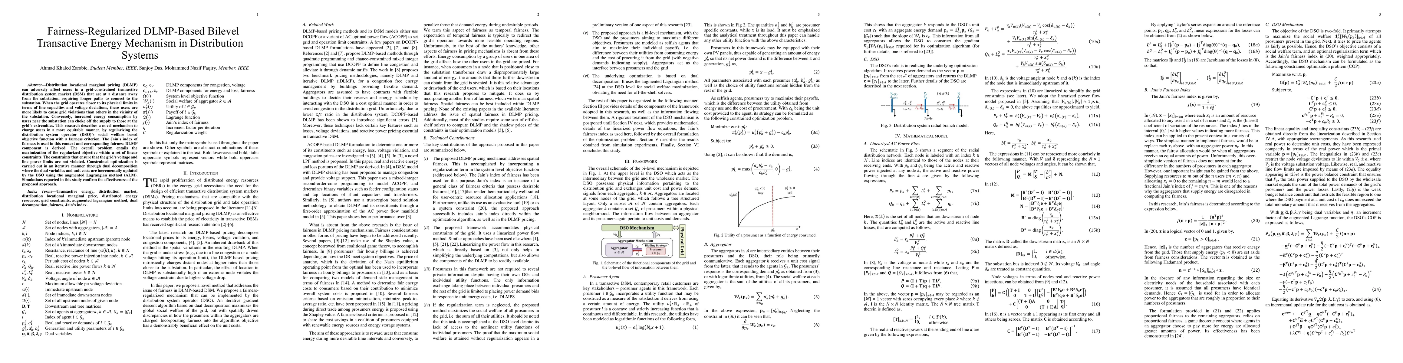 Distribution locational marginal pricing (DLMP) can adversely affect users in a grid-constrained transactive distribution system market (DSM) that are at a distance away from the substation, requiring longer paths to connect to the substation. When the grid operates closer to its physical limits in terms of line capacities and voltage deviations, these users are more likely to cause grid violations than others in the vicinity of the substation. Conversely, increased energy consumption by users near the substation can choke off the supply to those at the grid s extremities. This research describes a novel mechanism to charge users in a more equitable manner, by regularizing the distribution system operator (DSO)s social welfare based objective function with a fairness criterion. The Jains index of fairness is used in this context and corresponding fairness DLMP component is derived. The overall problem entails the maximization of the regularized objective within a set of linear constraints. The constraints that ensure that the grids voltage and line power limits are not violated. Constrained optimization is carried out in an iterative manner through dual decomposition where the dual variables and unit costs are incrementally updated by the DSO using the augmented Lagrangian method (ALM). Simulations reported in this study confirm the effectiveness of the proposed approach.
