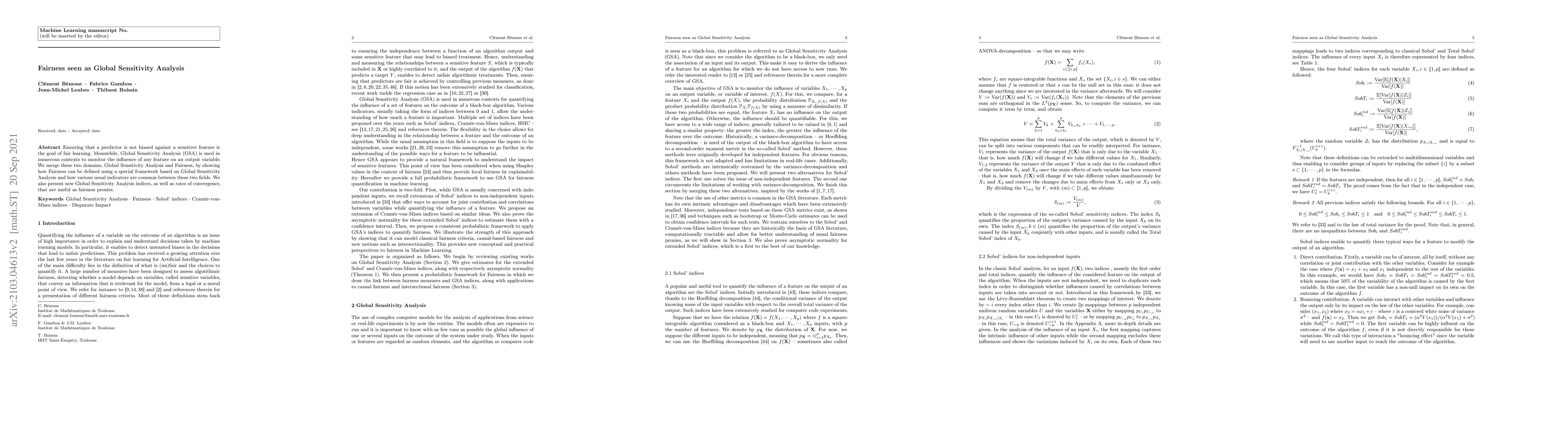 Ensuring that a predictor is not biased against a sensible feature is the key of Fairness learning. Conversely, Global Sensitivity Analysis is used in numerous contexts to monitor the influence of any feature on an output variable. We reconcile these two domains by showing how Fairness can be seen as a special framework of Global Sensitivity Analysis and how various usual indicators are common between these two fields. We also present new Global Sensitivity Analysis indices, as well as rates of convergence, that are useful as fairness proxies.