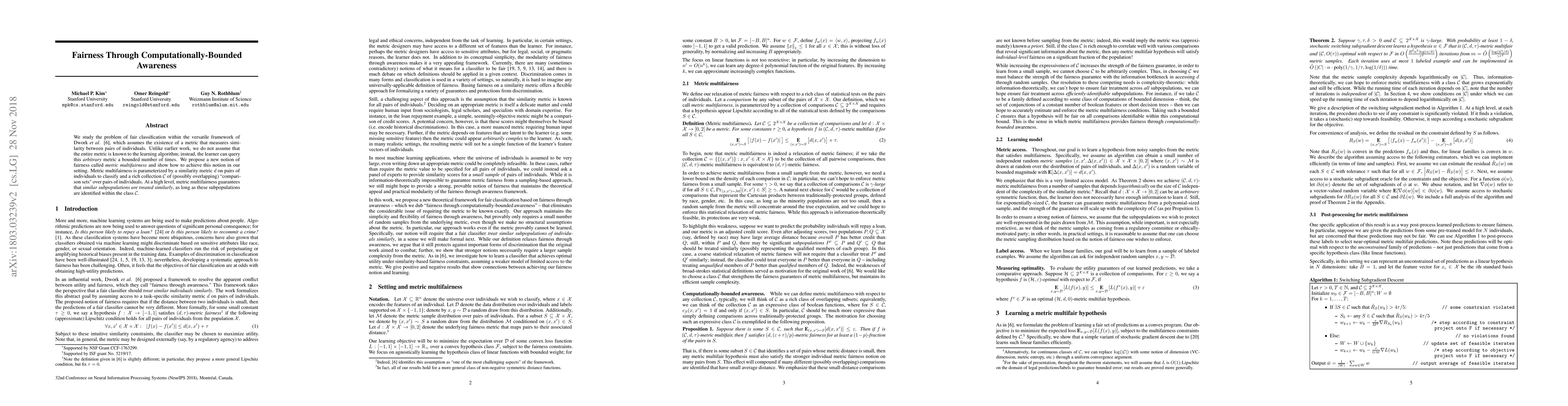 This paper introduces a novel notion of fairness, termed metric multifairness, for classification tasks where the learning algorithm can only query a similarity metric a limited number of times. It ensures that similar subpopulations identified by a given collection of comparison sets are treated similarly, without requiring full knowledge of the metric.