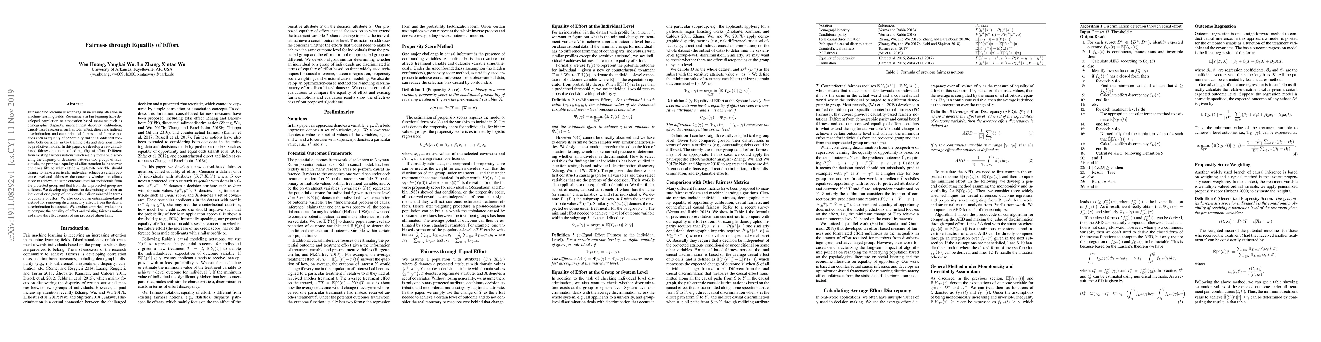 Fair machine learning is receiving an increasing attention in machine learning fields. Researchers in fair learning have developed correlation or association-based measures such as demographic disparity, mistreatment disparity, calibration, causal-based measures such as total effect, direct and indirect discrimination, and counterfactual fairness, and fairness notions such as equality of opportunity and equal odds that consider both decisions in the training data and decisions made by predictive models. In this paper, we develop a new causal-based fairness notation, called equality of effort. Different from existing fairness notions which mainly focus on discovering the disparity of decisions between two groups of individuals, the proposed equality of effort notation helps answer questions like to what extend a legitimate variable should change to make a particular individual achieve a certain outcome level and addresses the concerns whether the efforts made to achieve the same outcome level for individuals from the protected group and that from the unprotected group are different. We develop algorithms for determining whether an individual or a group of individuals is discriminated in terms of equality of effort. We also develop an optimization-based method for removing discriminatory effects from the data if discrimination is detected. We conduct empirical evaluations to compare the equality of effort and existing fairness notion and show the effectiveness of our proposed algorithms.