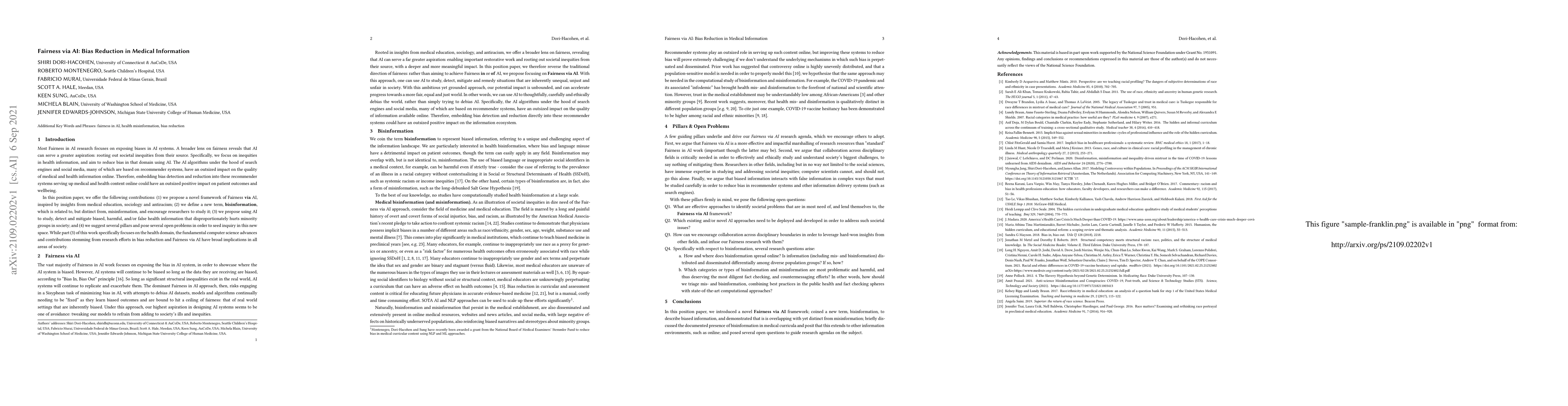 Most Fairness in AI research focuses on exposing biases in AI systems. A broader lens on fairness reveals that AI can serve a greater aspiration: rooting out societal inequities from their source. Specifically, we focus on inequities in health information, and aim to reduce bias in that domain using AI. The AI algorithms under the hood of search engines and social media, many of which are based on recommender systems, have an outsized impact on the quality of medical and health information online. Therefore, embedding bias detection and reduction into these recommender systems serving up medical and health content online could have an outsized positive impact on patient outcomes and wellbeing. In this position paper, we offer the following contributions: (1) we propose a novel framework of Fairness via AI, inspired by insights from medical education, sociology and antiracism; (2) we define a new term, bisinformation, which is related to, but distinct from, misinformation, and encourage researchers to study it; (3) we propose using AI to study, detect and mitigate biased, harmful, and/or false health information that disproportionately hurts minority groups in society; and (4) we suggest several pillars and pose several open problems in order to seed inquiry in this new space. While part (3) of this work specifically focuses on the health domain, the fundamental computer science advances and contributions stemming from research efforts in bias reduction and Fairness via AI have broad implications in all areas of society.