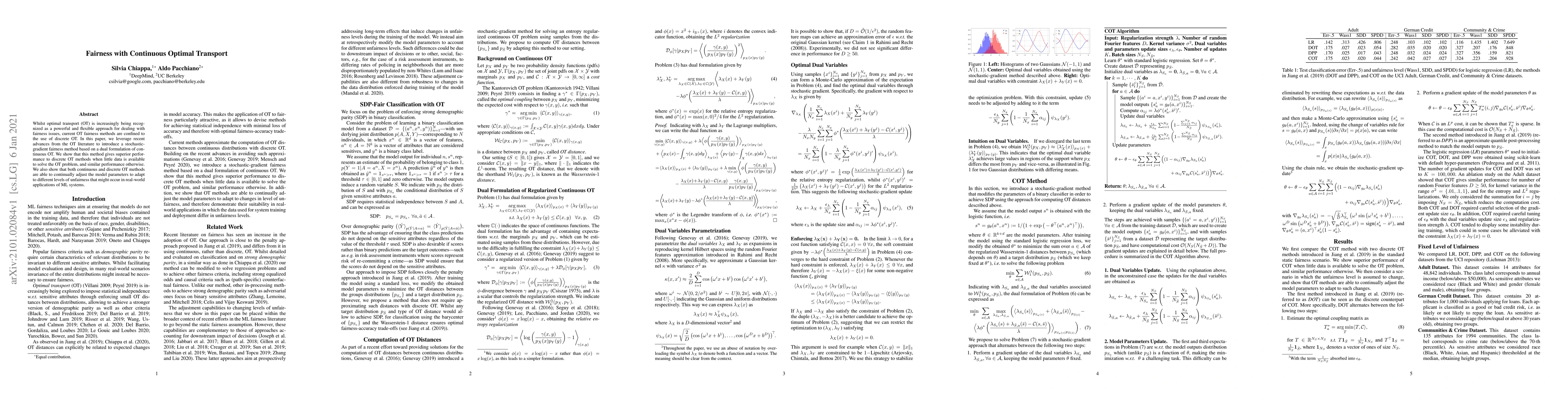 This paper introduces a stochastic-gradient method for fairness based on continuous optimal transport, demonstrating superior performance over discrete methods when data is limited. It also shows that both continuous and discrete OT methods can adapt to varying levels of unfairness in real-world applications.