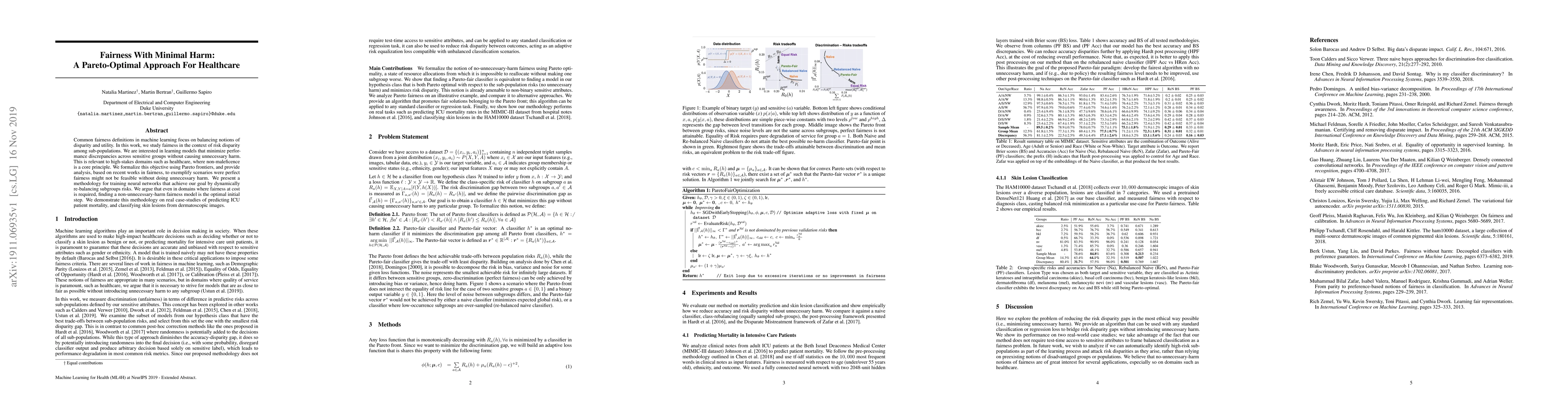 This paper proposes a Pareto-optimal approach to achieve fairness in healthcare models by minimizing performance discrepancies across sensitive groups while avoiding unnecessary harm. The methodology dynamically rebalances subgroup risks and demonstrates its effectiveness in predicting ICU mortality and classifying skin lesions.