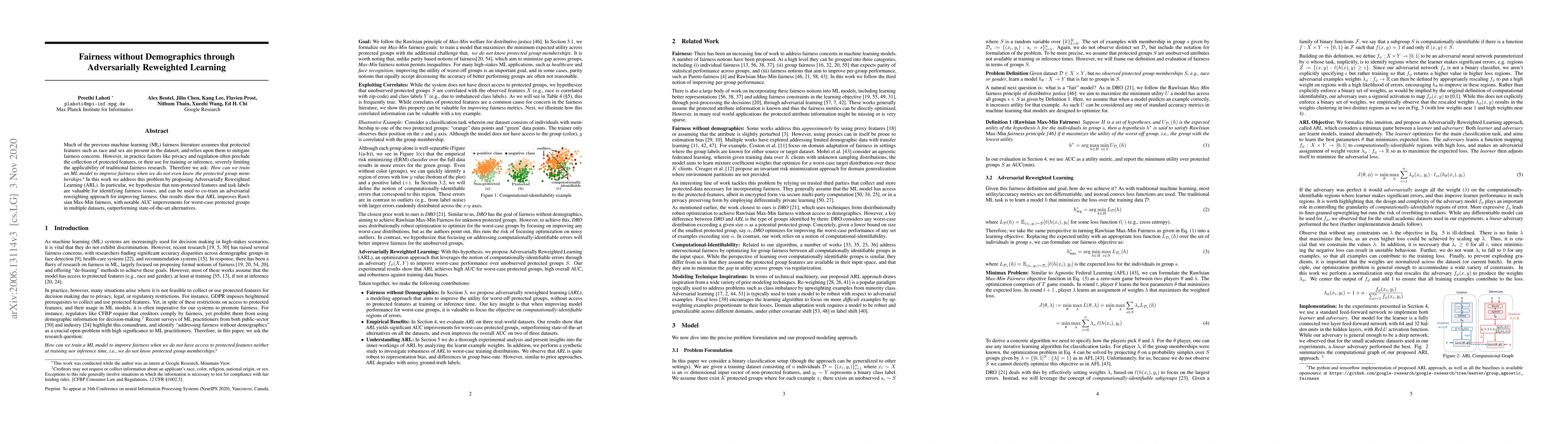 This paper proposes Adversarially Reweighted Learning (ARL) to improve fairness in machine learning models without using protected demographic features, addressing privacy and regulatory constraints. ARL leverages non-protected features and task labels to identify and mitigate fairness issues, demonstrating improved Rawlsian Max-Min fairness and significant AUC gains for disadvantaged groups.