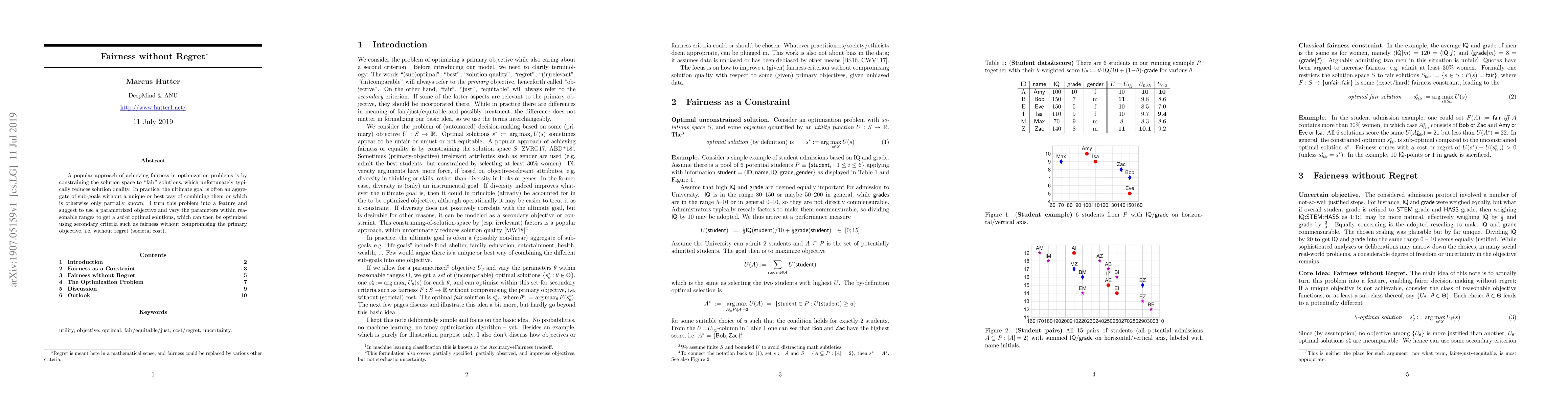 A popular approach of achieving fairness in optimization problems is by constraining the solution space to "fair" solutions, which unfortunately typically reduces solution quality. In practice, the ultimate goal is often an aggregate of sub-goals without a unique or best way of combining them or which is otherwise only partially known. I turn this problem into a feature and suggest to use a parametrized objective and vary the parameters within reasonable ranges to get a "set" of optimal solutions, which can then be optimized using secondary criteria such as fairness without compromising the primary objective, i.e. without regret (societal cost).