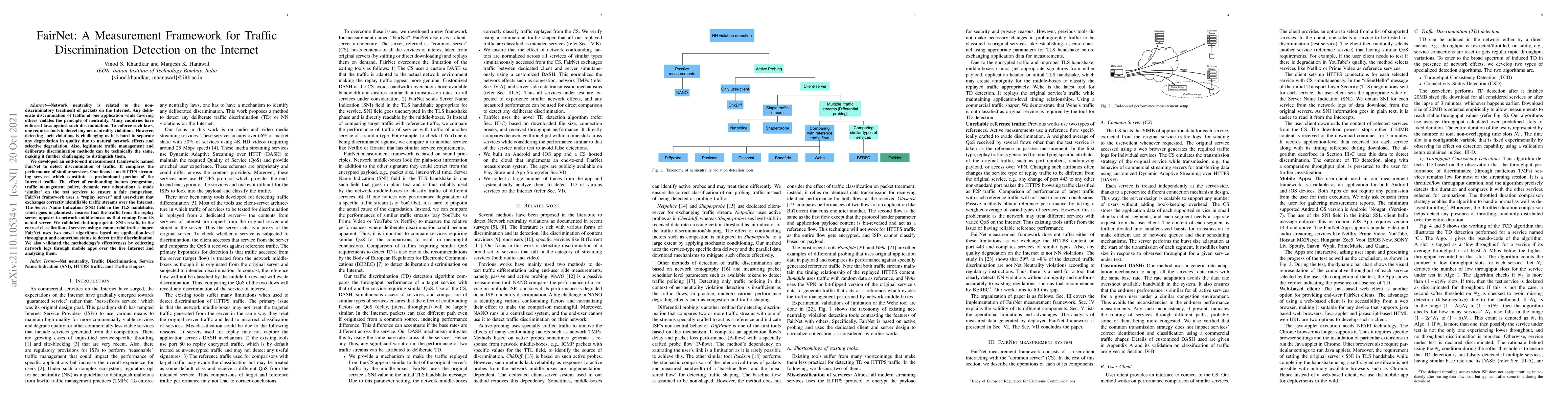 Network neutrality is related to the non-discriminatory treatment of packets on the Internet. Any deliberate discrimination of traffic of one application while favoring others violates the principle of neutrality. Many countries have enforced laws against such discrimination. To enforce such laws, one requires tools to detect any net neutrality violations. However, detecting such violations is challenging as it is hard to separate any degradation in quality due to natural network effects and selective degradation. Also, legitimate traffic management and deliberate discrimination methods can be technically the same, making it further challenging to distinguish them. We developed an end-to-end measurement framework named FairNet to detect discrimination of traffic. It compares the performance of similar services. Our focus is on HTTPS streaming services which constitute a predominant portion of the Internet traffic. The effect of confounding factors (congestion, traffic management policy, dynamic rate adaptation) is made `similar' on the test services to ensure a fair comparison. FairNet framework uses a ``replay server'' and user-client that exchanges correctly identifiable traffic streams over the Internet. The Server Name Indication (SNI) field in the TLS handshake, which goes in plaintext, ensures that the traffic from the replay server appears to network middle-boxes as that coming from its actual server. We validated that appropriate SNIs results in the correct classification of services using a commercial traffic shaper. FairNet uses two novel algorithms based on application-level throughput and connection status to detect traffic discrimination. We also validated the methodology's effectiveness by collecting network logs through mobile apps over the live Internet and analyzing them.