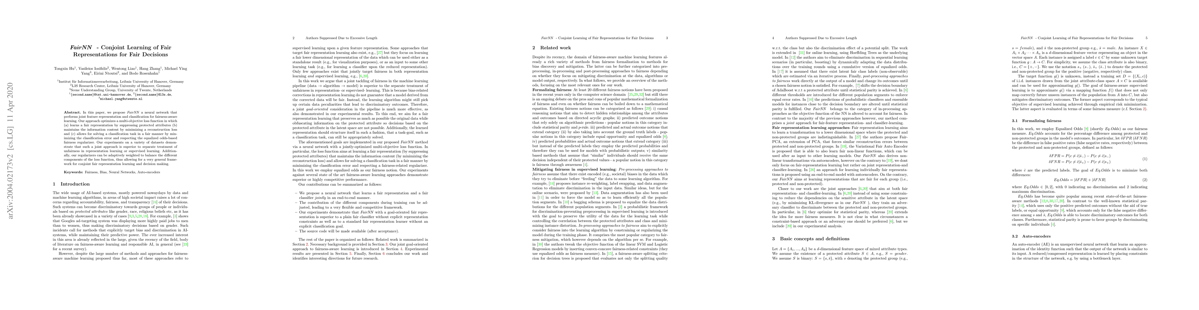 In this paper, we propose FairNN a neural network that performs joint feature representation and classification for fairness-aware learning. Our approach optimizes a multi-objective loss function in which (a) learns a fair representation by suppressing protected attributes (b) maintains the information content by minimizing a reconstruction loss and (c) allows for solving a classification task in a fair manner by minimizing the classification error and respecting the equalized odds-based fairness regularized. Our experiments on a variety of datasets demonstrate that such a joint approach is superior to separate treatment of unfairness in representation learning or supervised learning. Additionally, our regularizers can be adaptively weighted to balance the different components of the loss function, thus allowing for a very general framework for conjoint fair representation learning and decision making.
