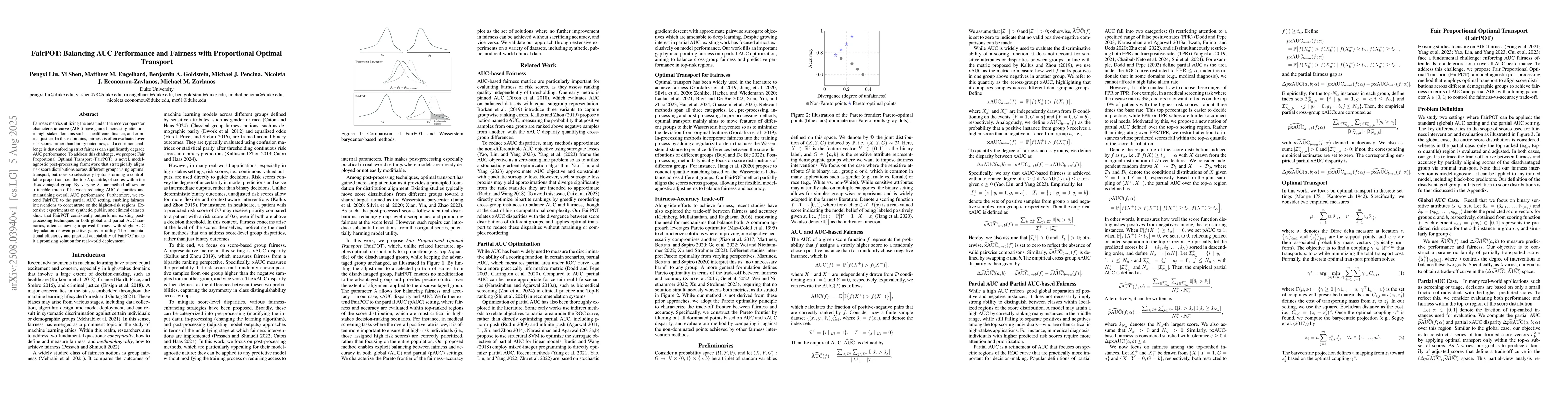 Fairness metrics utilizing the area under the receiver operator characteristic curve (AUC) have gained increasing attention in high-stakes domains such as healthcare, finance, and criminal justice. In these domains, fairness is often evaluated over risk scores rather than binary outcomes, and a common challenge is that enforcing strict fairness can significantly degrade AUC performance. To address this challenge, we propose Fair Proportional Optimal Transport (FairPOT), a novel, model-agnostic post-processing framework that strategically aligns risk score distributions across different groups using optimal transport, but does so selectively by transforming a controllable proportion, i.e., the top-lambda quantile, of scores within the disadvantaged group. By varying lambda, our method allows for a tunable trade-off between reducing AUC disparities and maintaining overall AUC performance. Furthermore, we extend FairPOT to the partial AUC setting, enabling fairness interventions to concentrate on the highest-risk regions. Extensive experiments on synthetic, public, and clinical datasets show that FairPOT consistently outperforms existing post-processing techniques in both global and partial AUC scenarios, often achieving improved fairness with slight AUC degradation or even positive gains in utility. The computational efficiency and practical adaptability of FairPOT make it a promising solution for real-world deployment.