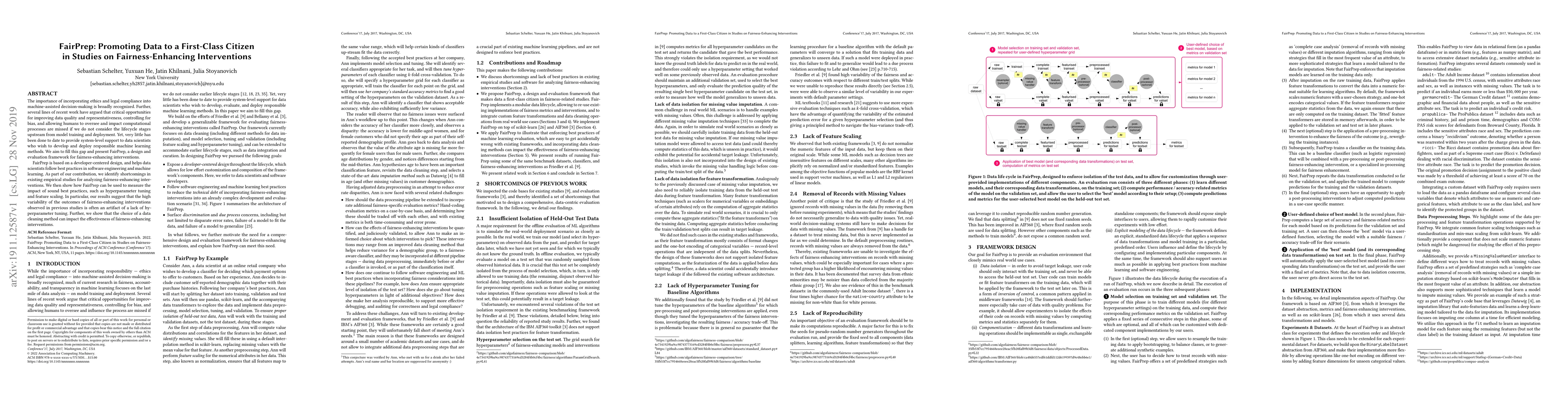 The importance of incorporating ethics and legal compliance into machine-assisted decision-making is broadly recognized. Further, several lines of recent work have argued that critical opportunities for improving data quality and representativeness, controlling for bias, and allowing humans to oversee and impact computational processes are missed if we do not consider the lifecycle stages upstream from model training and deployment. Yet, very little has been done to date to provide system-level support to data scientists who wish to develop and deploy responsible machine learning methods. We aim to fill this gap and present FairPrep, a design and evaluation framework for fairness-enhancing interventions. FairPrep is based on a developer-centered design, and helps data scientists follow best practices in software engineering and machine learning. As part of our contribution, we identify shortcomings in existing empirical studies for analyzing fairness-enhancing interventions. We then show how FairPrep can be used to measure the impact of sound best practices, such as hyperparameter tuning and feature scaling. In particular, our results suggest that the high variability of the outcomes of fairness-enhancing interventions observed in previous studies is often an artifact of a lack of hyperparameter tuning. Further, we show that the choice of a data cleaning method can impact the effectiveness of fairness-enhancing interventions.