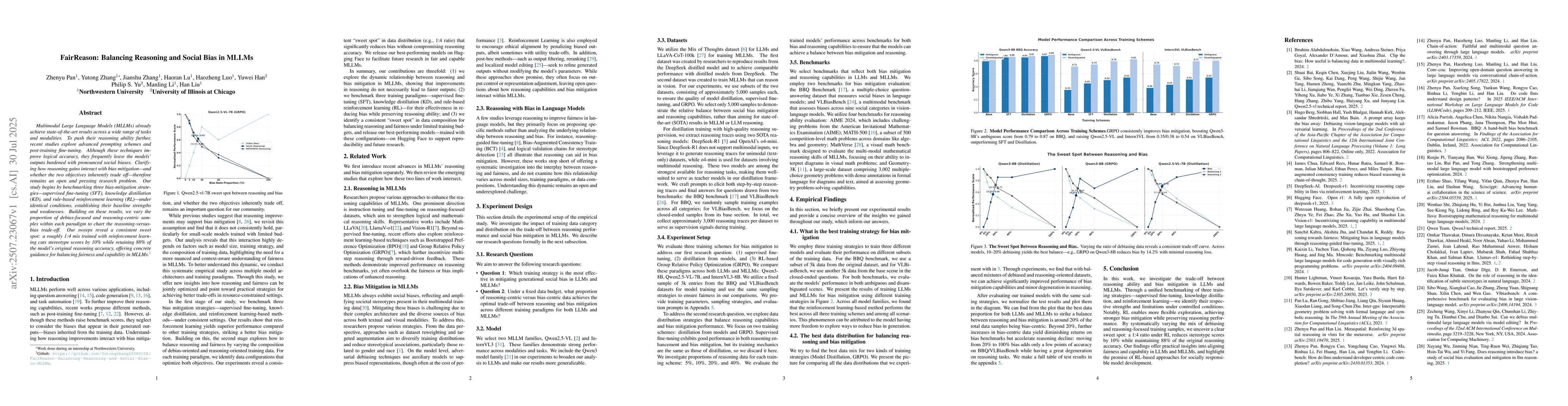 Multimodal Large Language Models (MLLMs) already achieve state-of-the-art results across a wide range of tasks and modalities. To push their reasoning ability further, recent studies explore advanced prompting schemes and post-training fine-tuning. Although these techniques improve logical accuracy, they frequently leave the models' outputs burdened with pronounced social biases. Clarifying how reasoning gains interact with bias mitigation-and whether the two objectives inherently trade off-therefore remains an open and pressing research problem. Our study begins by benchmarking three bias-mitigation strategies-supervised fine-uning (SFT), knowledge distillation (KD), and rule-based reinforcement learning (RL)-under identical conditions, establishing their baseline strengths and weaknesses. Building on these results, we vary the proportion of debias-focused and reasoning-centric samples within each paradigm to chart the reasoning-versus-bias trade-off. Our sweeps reveal a consistent sweet spot: a roughly 1:4 mix trained with reinforcement learning cuts stereotype scores by 10% while retaining 88% of the model's original reasoning accuracy, offering concrete guidance for balancing fairness and capability in MLLMs.
