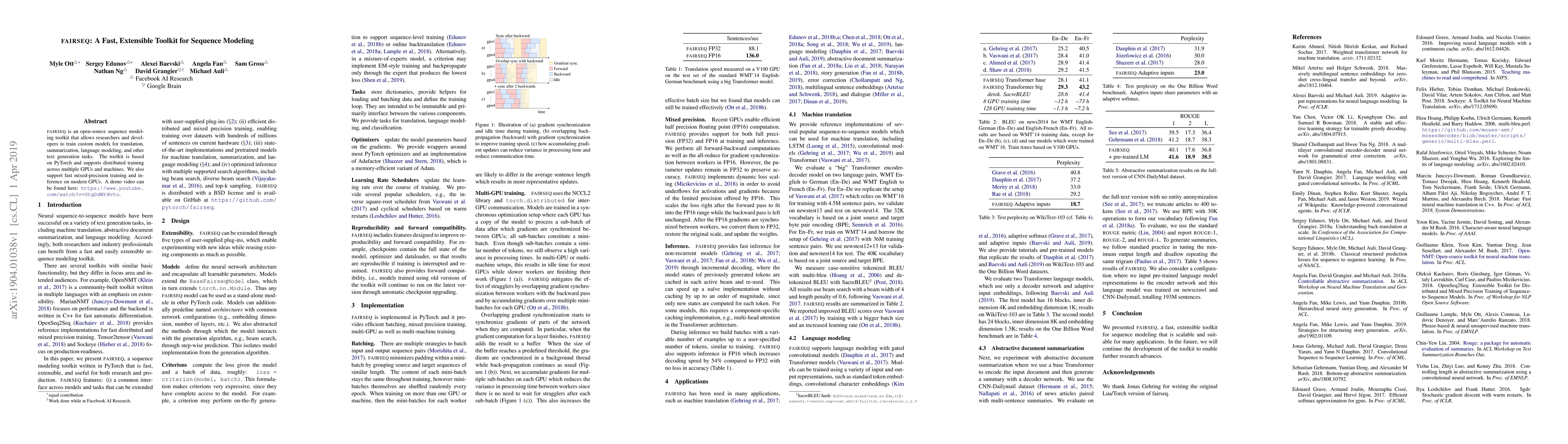 fairseq is an open-source sequence modeling toolkit that allows researchers and developers to train custom models for translation, summarization, language modeling, and other text generation tasks. The toolkit is based on PyTorch and supports distributed training across multiple GPUs and machines. We also support fast mixed-precision training and inference on modern GPUs. A demo video can be found at https://www.youtube.com/watch?v=OtgDdWtHvto