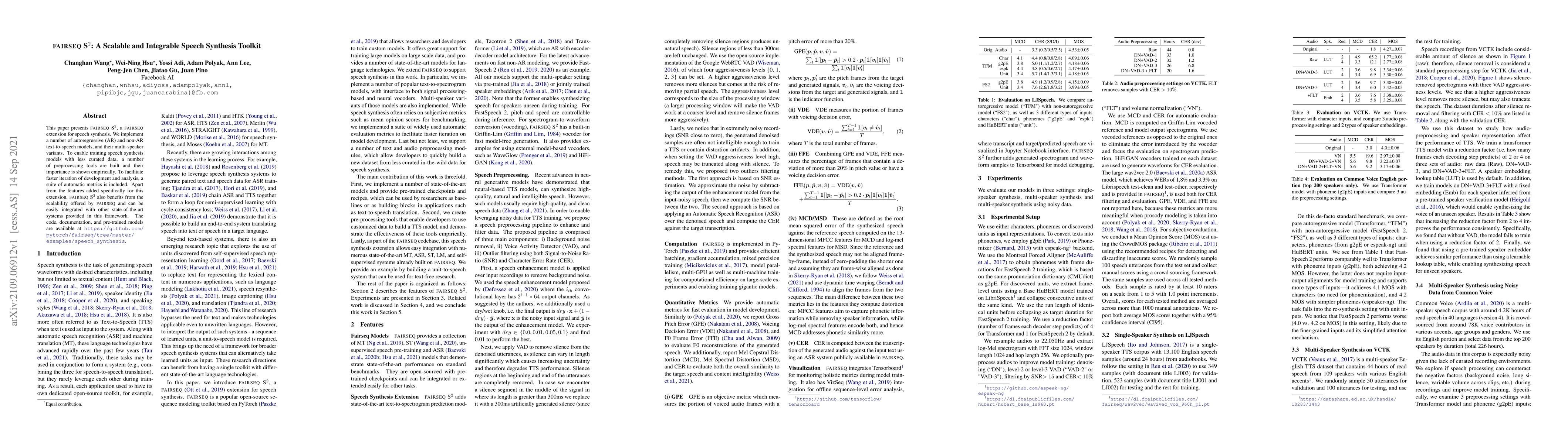fairseq S^2 is a scalable speech synthesis toolkit that offers customizable models, automatic metrics, and pre-trained models, enabling faster development and analysis of text-to-speech systems.