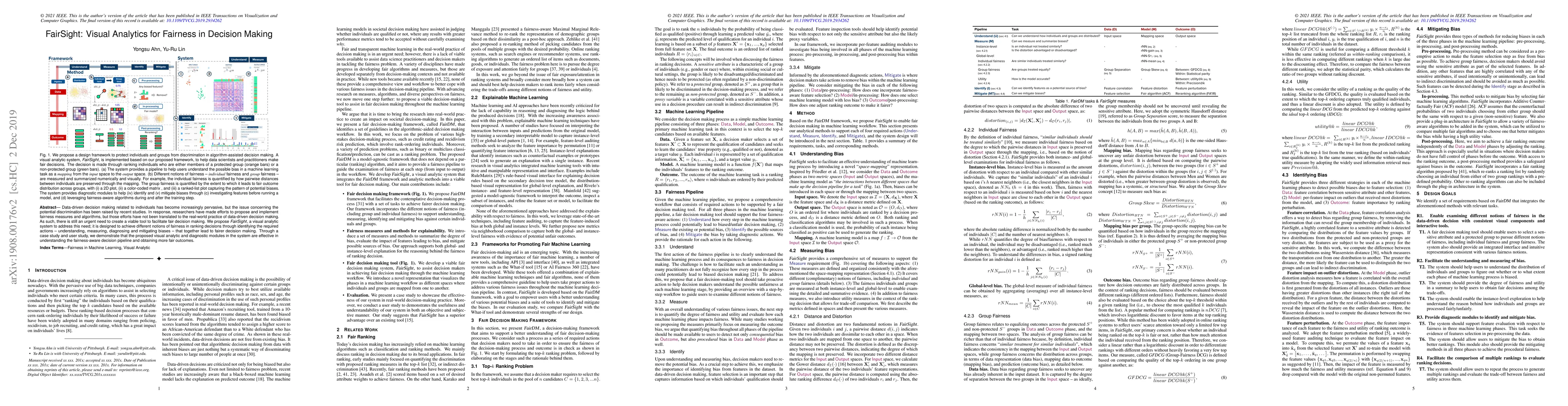 FairSight is a visual analytics tool designed to facilitate fair decision making by identifying and mitigating biases in data-driven processes. The system aids in understanding, measuring, diagnosing, and mitigating biases to achieve fairer outcomes, as demonstrated through a case study and user study.