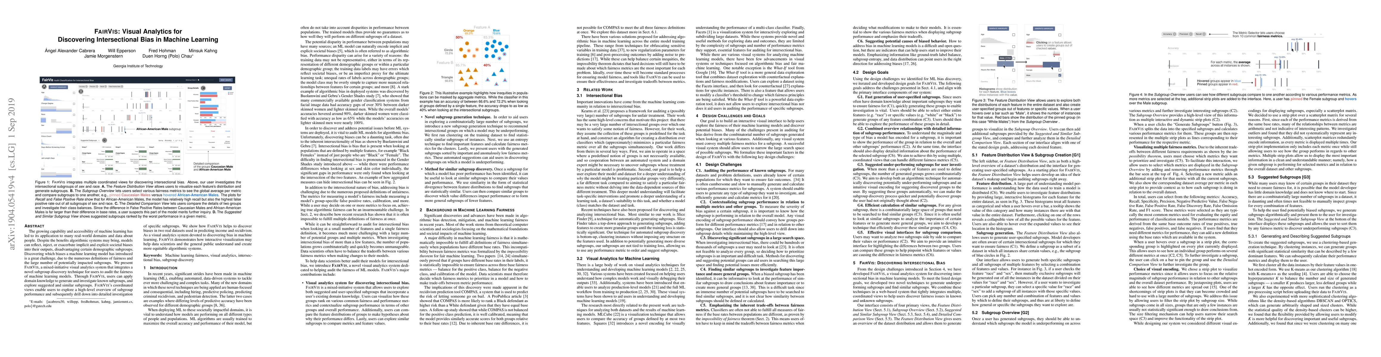 FairVis is a visual analytics system designed to help users discover intersectional biases in machine learning models by integrating a novel subgroup discovery technique. It enables users to explore and investigate fairness across various demographic subgroups, ultimately aiding in the creation of more equitable algorithmic systems.
