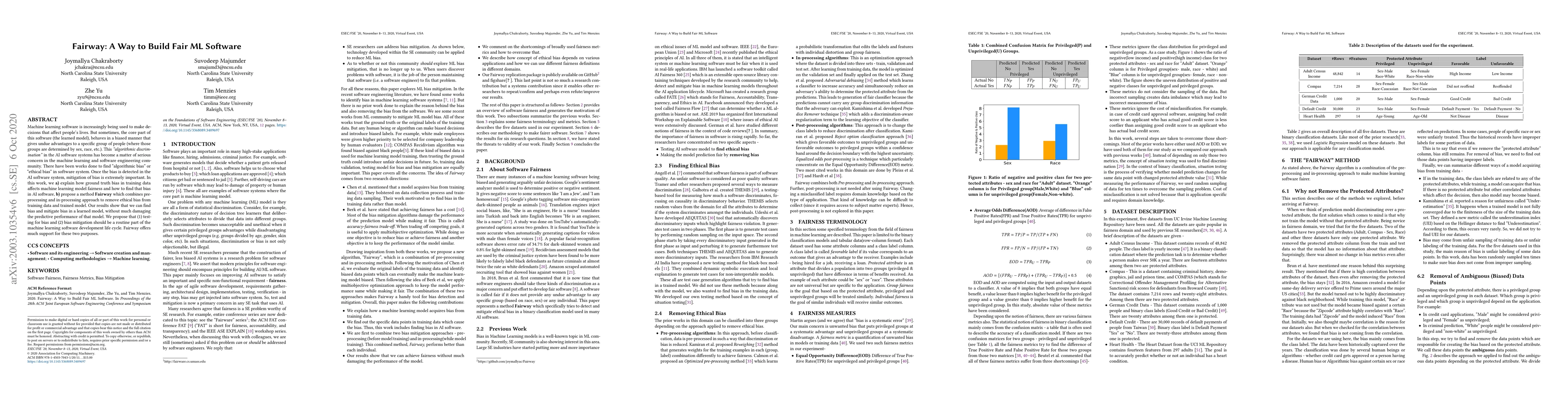 Machine learning software is increasingly being used to make decisions that affect people's lives. But sometimes, the core part of this software (the learned model), behaves in a biased manner that gives undue advantages to a specific group of people (where those groups are determined by sex, race, etc.). This "algorithmic discrimination" in the AI software systems has become a matter of serious concern in the machine learning and software engineering community. There have been works done to find "algorithmic bias" or "ethical bias" in the software system. Once the bias is detected in the AI software system, the mitigation of bias is extremely important. In this work, we a)explain how ground-truth bias in training data affects machine learning model fairness and how to find that bias in AI software,b)propose a methodFairwaywhich combines pre-processing and in-processing approach to remove ethical bias from training data and trained model. Our results show that we can find bias and mitigate bias in a learned model, without much damaging the predictive performance of that model. We propose that (1) test-ing for bias and (2) bias mitigation should be a routine part of the machine learning software development life cycle. Fairway offers much support for these two purposes.