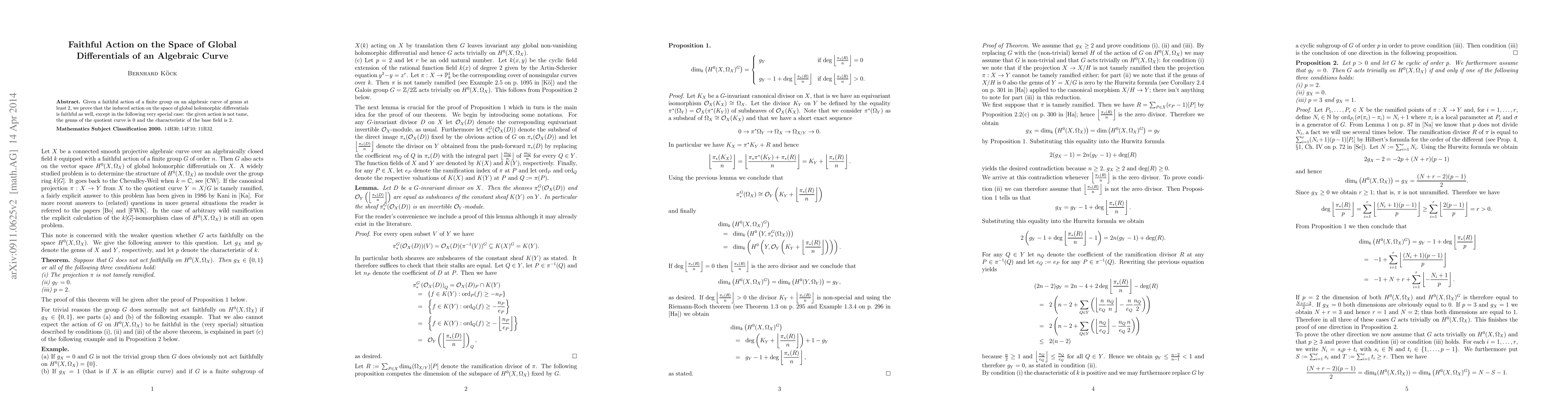 Summary: The paper proves that a finite group's faithful action on an algebraic curve of genus at least 2 also faithfully acts on the space of global holomorphic differentials, except when the action is not tame, the quotient curve has genus 0, and the base field's characteristic is 2.