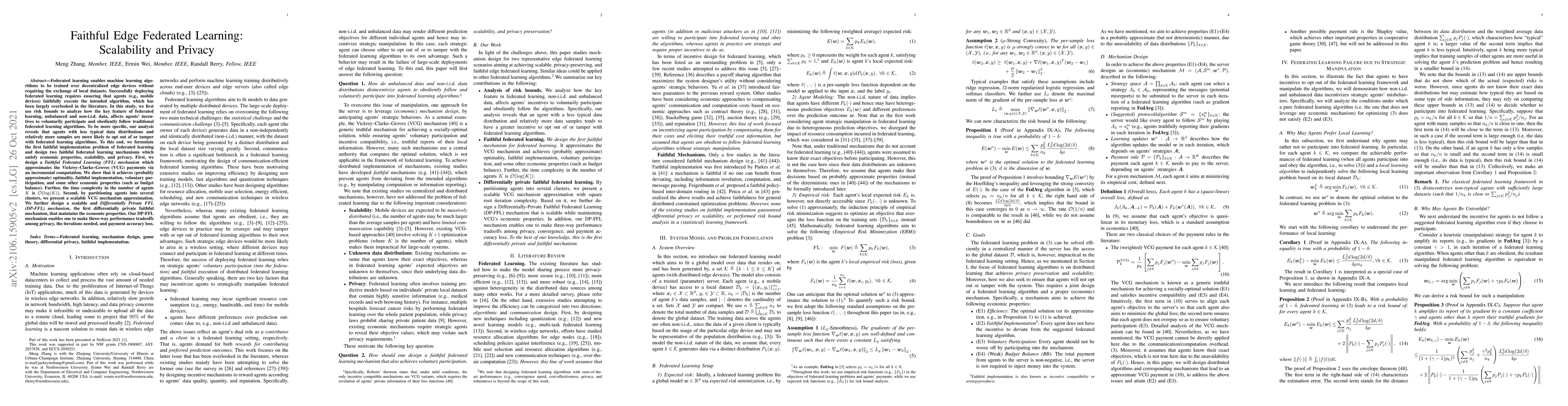 Federated learning enables machine learning algorithms to be trained over a network of multiple decentralized edge devices without requiring the exchange of local datasets. Successfully deploying federated learning requires ensuring that agents (e.g., mobile devices) faithfully execute the intended algorithm, which has been largely overlooked in the literature. In this study, we first use risk bounds to analyze how the key feature of federated learning, unbalanced and non-i.i.d. data, affects agents' incentives to voluntarily participate and obediently follow traditional federated learning algorithms. To be more specific, our analysis reveals that agents with less typical data distributions and relatively more samples are more likely to opt out of or tamper with federated learning algorithms. To this end, we formulate the first faithful implementation problem of federated learning and design two faithful federated learning mechanisms which satisfy economic properties, scalability, and privacy. Further, the time complexity of computing all agents' payments in the number of agents is $\mathcal{O}(1)$. First, we design a Faithful Federated Learning (FFL) mechanism which approximates the Vickrey-Clarke-Groves (VCG) payments via an incremental computation. We show that it achieves (probably approximate) optimality, faithful implementation, voluntary participation, and some other economic properties (such as budget balance). Second, by partitioning agents into several subsets, we present a scalable VCG mechanism approximation. We further design a scalable and Differentially Private FFL (DP-FFL) mechanism, the first differentially private faithful mechanism, that maintains the economic properties. Our mechanism enables one to make three-way performance tradeoffs among privacy, the iterations needed, and payment accuracy loss.