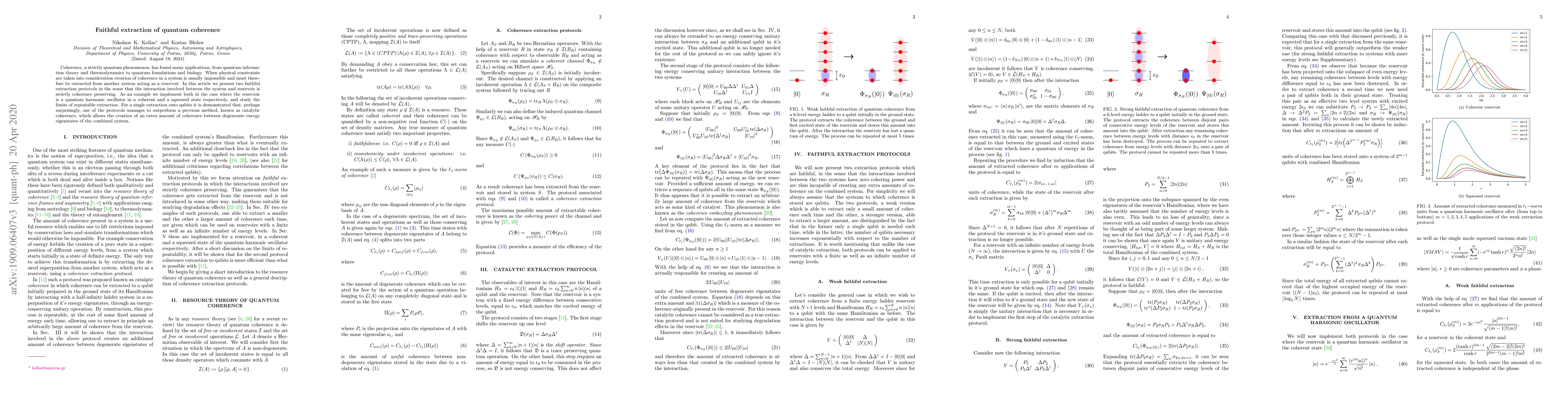 The paper presents two faithful extraction protocols for quantum coherence, ensuring the interaction between the system and reservoir is coherence-preserving. These protocols are demonstrated using a quantum harmonic oscillator as a reservoir in coherent and squeezed states.