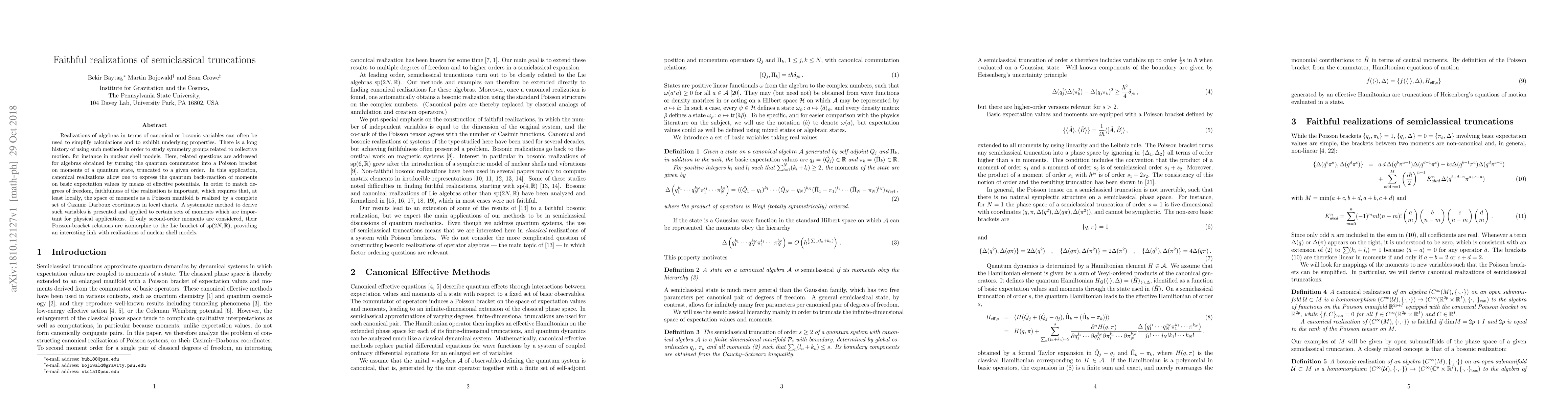 Realizations of algebras in terms of canonical or bosonic variables can often be used to simplify calculations and to exhibit underlying properties. There is a long history of using such methods in order to study symmetry groups related to collective motion, for instance in nuclear shell models. Here, related questions are addressed for algebras obtained by turning the quantum commutator into a Poisson bracket on moments of a quantum state, truncated to a given order. In this application, canonical realizations allow one to express the quantum back-reaction of moments on basic expectation values by means of effective potentials. In order to match degrees of freedom, faithfulness of the realization is important, which requires that, at least locally, the space of moments as a Poisson manifold is realized by a complete set of Casimir-Darboux coordinates in local charts. A systematic method to derive such variables is presented and applied to certain sets of moments which are important for physical applications. If only second-order moments are considered, their Poisson-bracket relations are isomorphic to the Lie bracket of sp(2N,R), providing an interesting link with realizations of nuclear shell models.