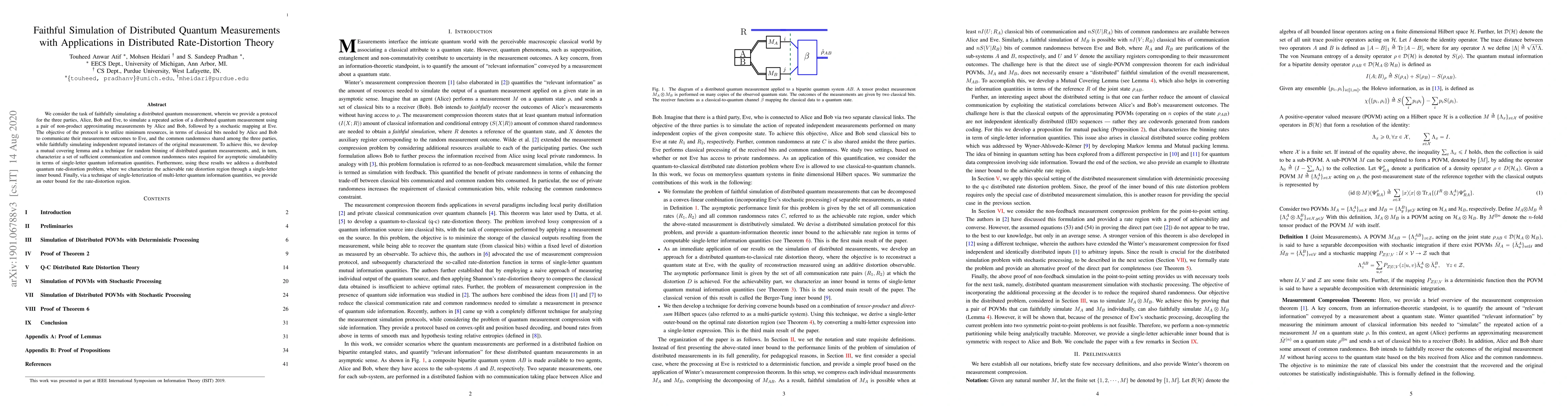 We consider the task of faithfully simulating a distributed quantum measurement, wherein we provide a protocol for the three parties, Alice, Bob and Eve, to simulate a repeated action of a distributed quantum measurement using a pair of non-product approximating measurements by Alice and Bob, followed by a stochastic mapping at Eve. The objective of the protocol is to utilize minimum resources, in terms of classical bits needed by Alice and Bob to communicate their measurement outcomes to Eve, and the common randomness shared among the three parties, while faithfully simulating independent repeated instances of the original measurement. To achieve this, we develop a mutual covering lemma and a technique for random binning of distributed quantum measurements, and, in turn, characterize a set of sufficient communication and common randomness rates required for asymptotic simulatability in terms of single-letter quantum information quantities. Furthermore, using these results we address a distributed quantum rate-distortion problem, where we characterize the achievable rate-distortion region through a single-letter inner bound. Finally, via a technique of single-letterization of multi-letter quantum information quantities, we provide an outer bound for the rate-distortion region.
