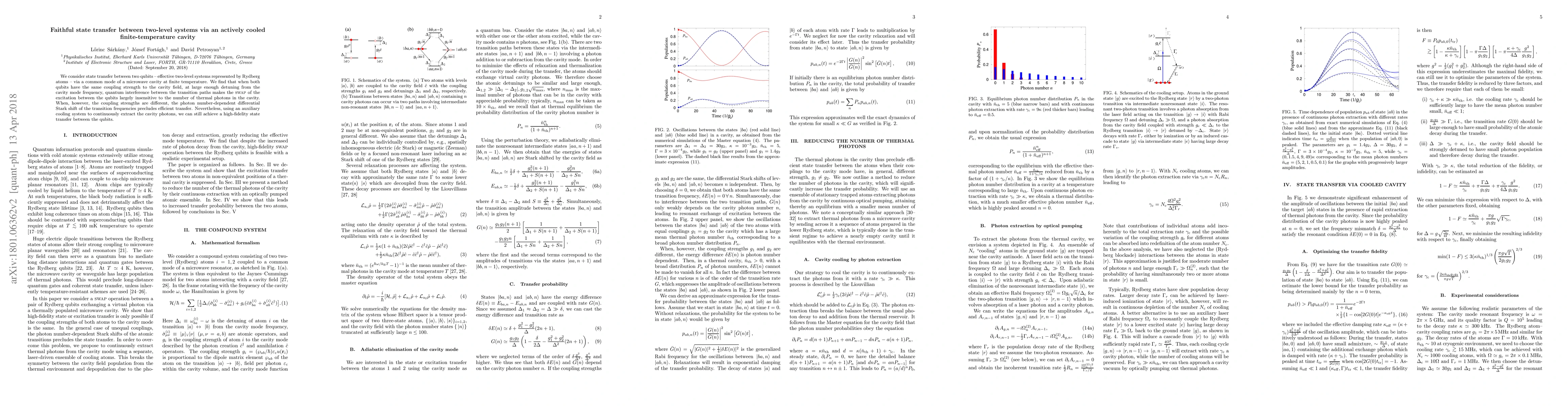 This paper investigates state transfer between two qubits via a finite-temperature microwave cavity, finding that quantum interference allows for robust transfer despite thermal photons when qubit coupling strengths are equal. With unequal coupling strengths, differential Stark shifts hinder transfer, but an actively cooled cavity system enables high-fidelity state transfer.