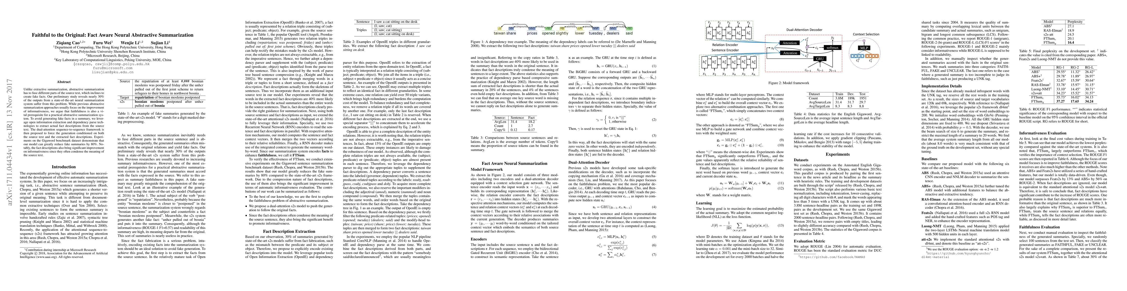 This paper proposes a novel dual-attention sequence-to-sequence framework for fact-aware neural abstractive summarization, aiming to reduce fake facts by leveraging open information extraction and dependency parse technologies. Experimental results show an 80% reduction in fake summaries and improved informativeness on the Gigaword dataset.