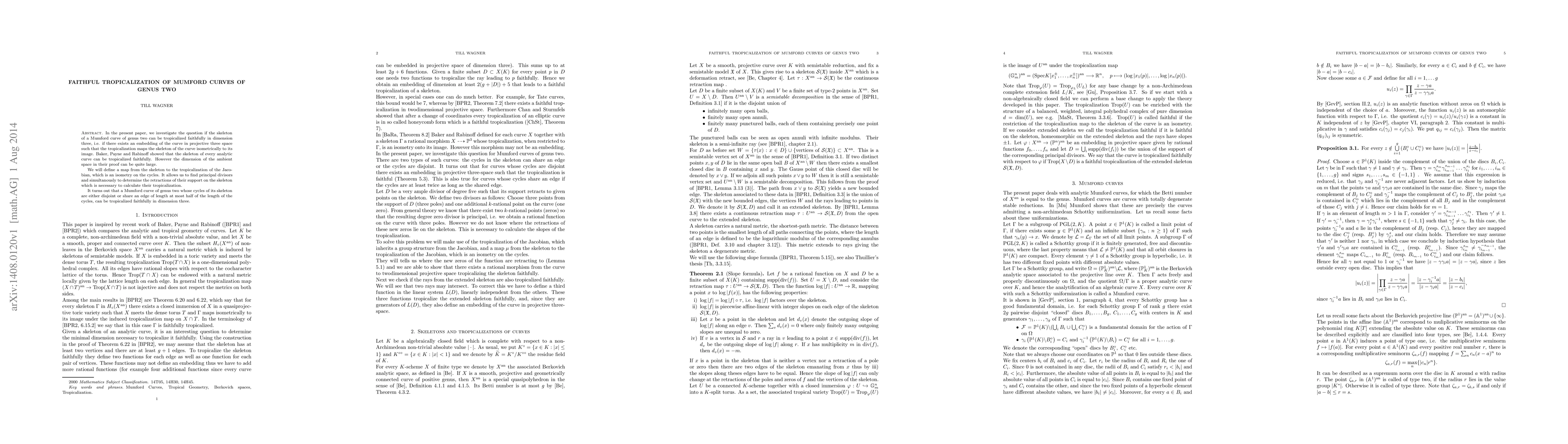 This paper explores whether the skeleton of a Mumford curve of genus two can be tropicalized faithfully in three-dimensional projective space, confirming that such curves can be embedded such that the tropicalization maps the skeleton isometrically. The authors define a map from the skeleton to the tropical Jacobian, proving faithful tropicalization for curves where the skeleton cycles are either disjoint or share an edge with specific length constraints.
