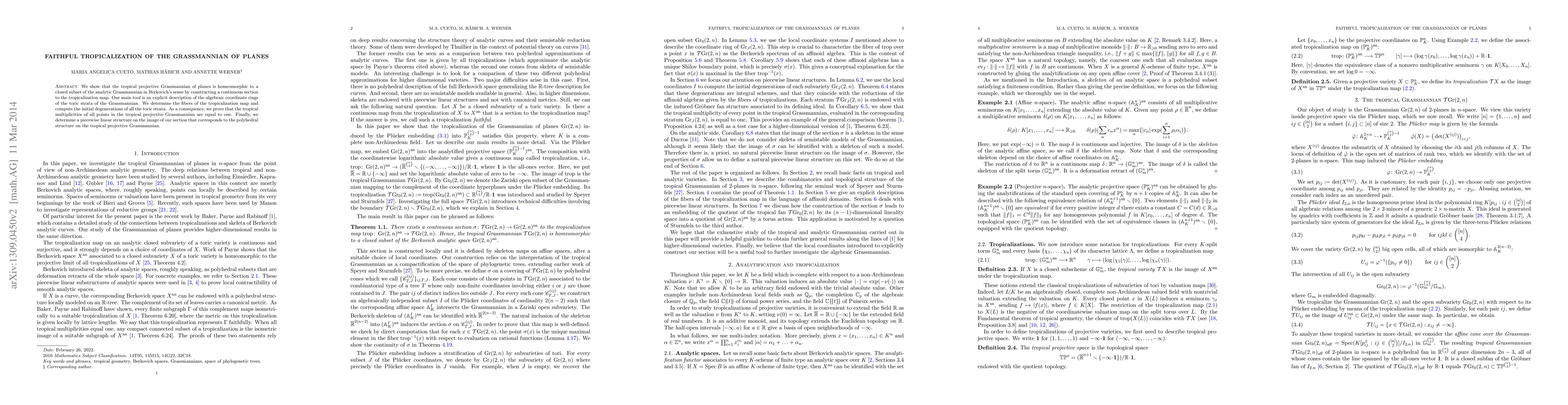 The paper constructs a continuous section to the tropicalization map for the Grassmannian of planes, thereby demonstrating a homeomorphism with a subset of the analytic Grassmannian, and provides a detailed analysis of toric strata degenerations.