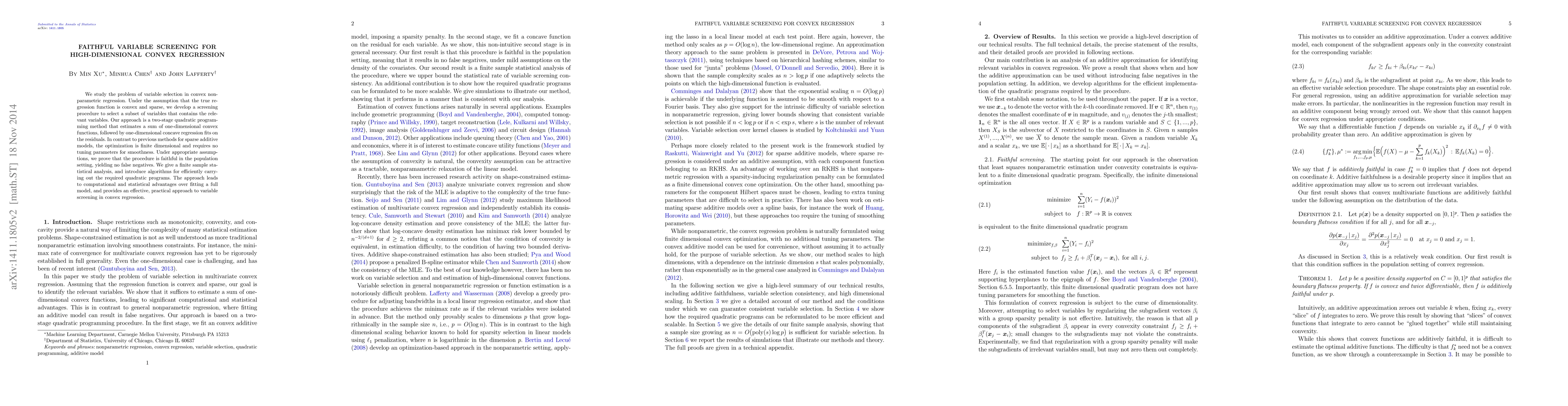 We study the problem of variable selection in convex nonparametric regression. Under the assumption that the true regression function is convex and sparse, we develop a screening procedure to select a subset of variables that contains the relevant variables. Our approach is a two-stage quadratic programming method that estimates a sum of one-dimensional convex functions, followed by one-dimensional concave regression fits on the residuals. In contrast to previous methods for sparse additive models, the optimization is finite dimensional and requires no tuning parameters for smoothness. Under appropriate assumptions, we prove that the procedure is faithful in the population setting, yielding no false negatives. We give a finite sample statistical analysis, and introduce algorithms for efficiently carrying out the required quadratic programs. The approach leads to computational and statistical advantages over fitting a full model, and provides an effective, practical approach to variable screening in convex regression.