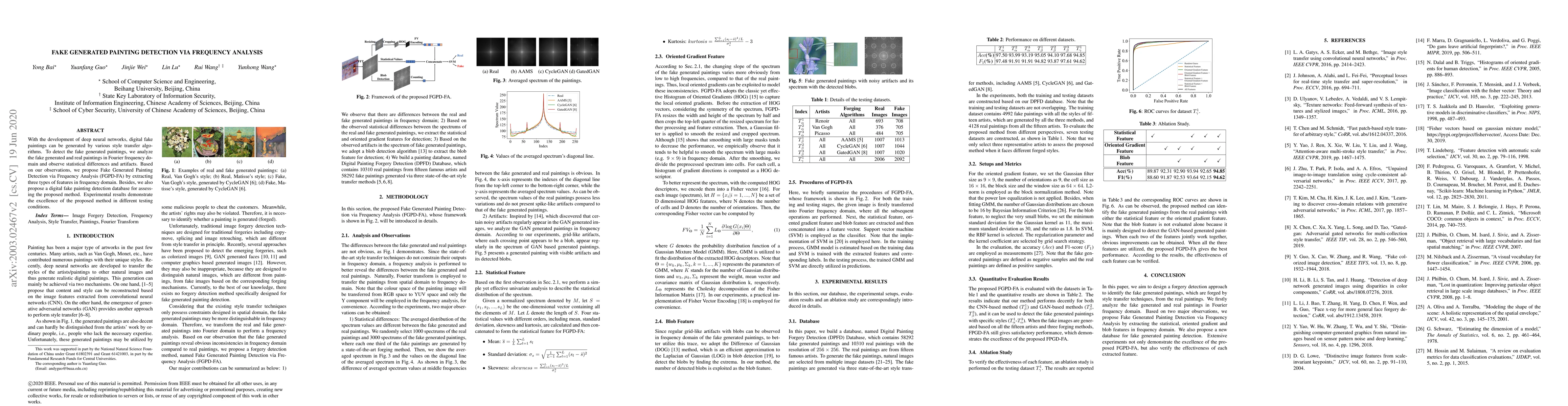 This paper proposes a method for detecting digitally generated fake paintings using frequency analysis in the Fourier domain, identifying statistical differences and artifacts between real and fake artworks. The FGPD-FA method extracts frequency domain features and is validated with an experimental dataset, showing superior performance in detecting fake paintings.