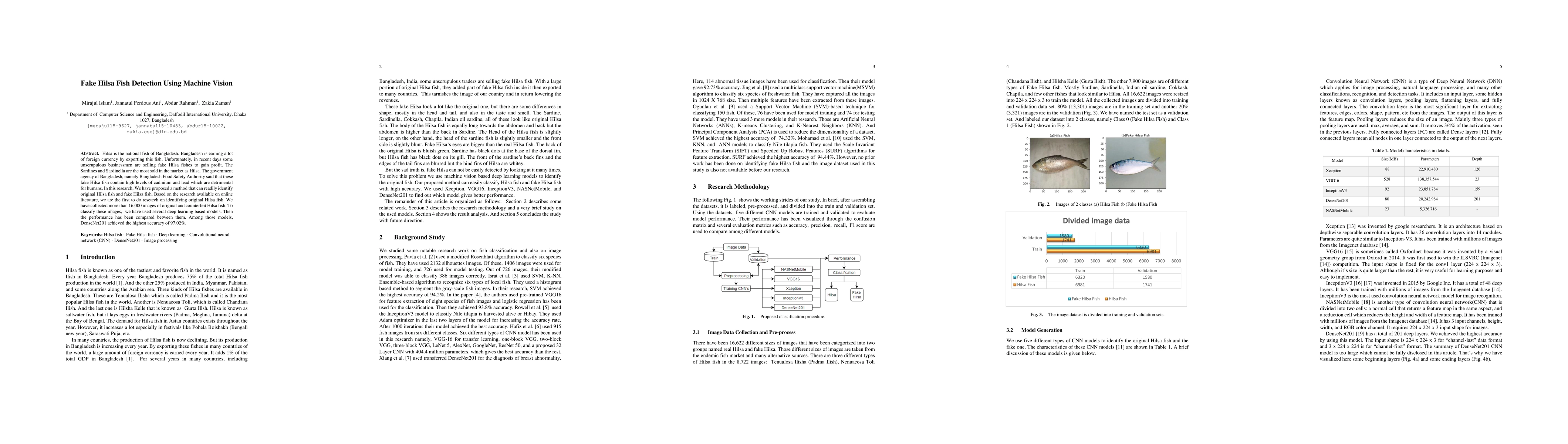 Hilsa is the national fish of Bangladesh. Bangladesh is earning a lot of foreign currency by exporting this fish. Unfortunately, in recent days, some unscrupulous businessmen are selling fake Hilsa fishes to gain profit. The Sardines and Sardinella are the most sold in the market as Hilsa. The government agency of Bangladesh, namely Bangladesh Food Safety Authority said that these fake Hilsa fish contain high levels of cadmium and lead which are detrimental for humans. In this research, we have proposed a method that can readily identify original Hilsa fish and fake Hilsa fish. Based on the research available on online literature, we are the first to do research on identifying original Hilsa fish. We have collected more than 16,000 images of original and counterfeit Hilsa fish. To classify these images, we have used several deep learning-based models. Then, the performance has been compared between them. Among those models, DenseNet201 achieved the highest accuracy of 97.02%.