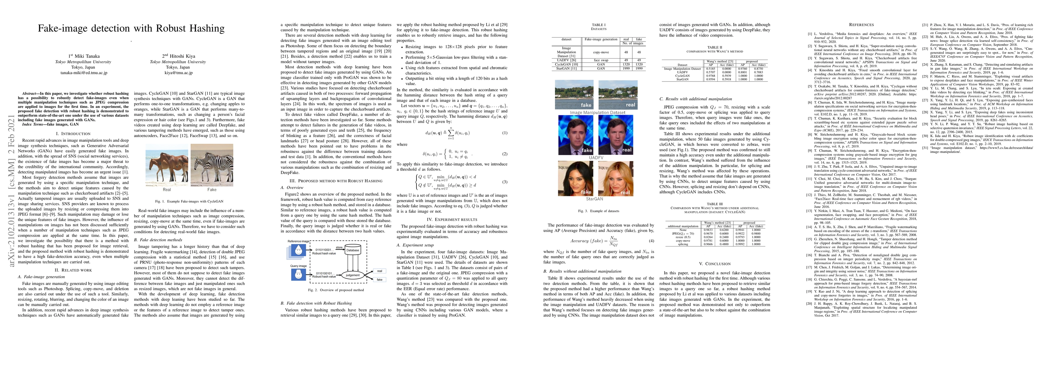 In this paper, we investigate whether robust hashing has a possibility to robustly detect fake-images even when multiple manipulation techniques such as JPEG compression are applied to images for the first time. In an experiment, the proposed fake detection with robust hashing is demonstrated to outperform state-of-the-art one under the use of various datasets including fake images generated with GANs.