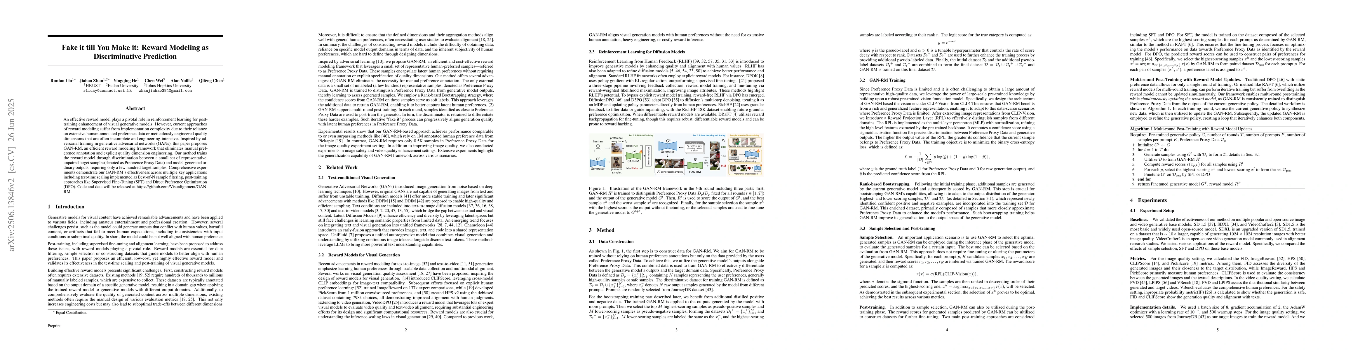 An effective reward model plays a pivotal role in reinforcement learning for post-training enhancement of visual generative models. However, current approaches of reward modeling suffer from implementation complexity due to their reliance on extensive human-annotated preference data or meticulously engineered quality dimensions that are often incomplete and engineering-intensive. Inspired by adversarial training in generative adversarial networks (GANs), this paper proposes GAN-RM, an efficient reward modeling framework that eliminates manual preference annotation and explicit quality dimension engineering. Our method trains the reward model through discrimination between a small set of representative, unpaired target samples(denoted as Preference Proxy Data) and model-generated ordinary outputs, requiring only a few hundred target samples. Comprehensive experiments demonstrate our GAN-RM's effectiveness across multiple key applications including test-time scaling implemented as Best-of-N sample filtering, post-training approaches like Supervised Fine-Tuning (SFT) and Direct Preference Optimization (DPO). Code and data will be released at https://github.com/Visualignment/GAN-RM.
